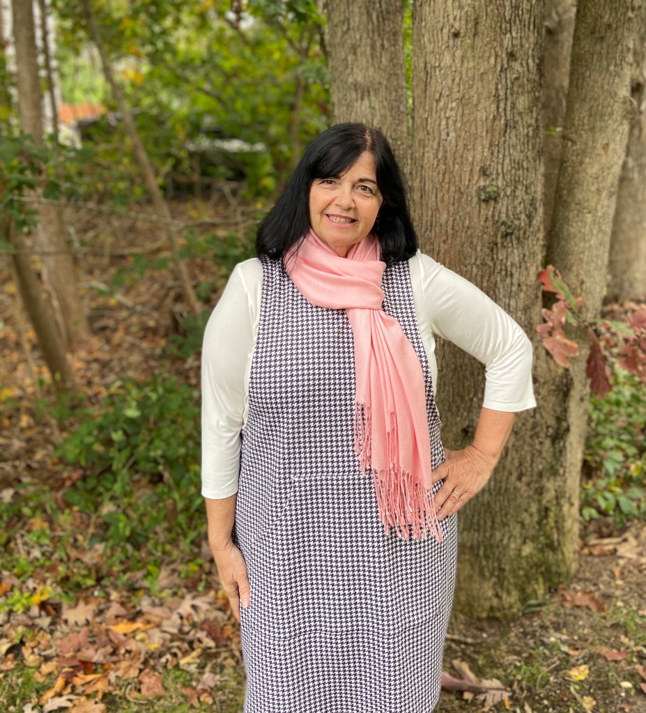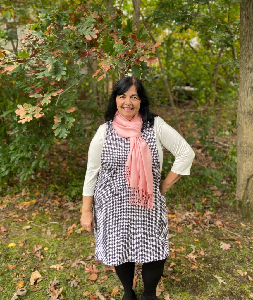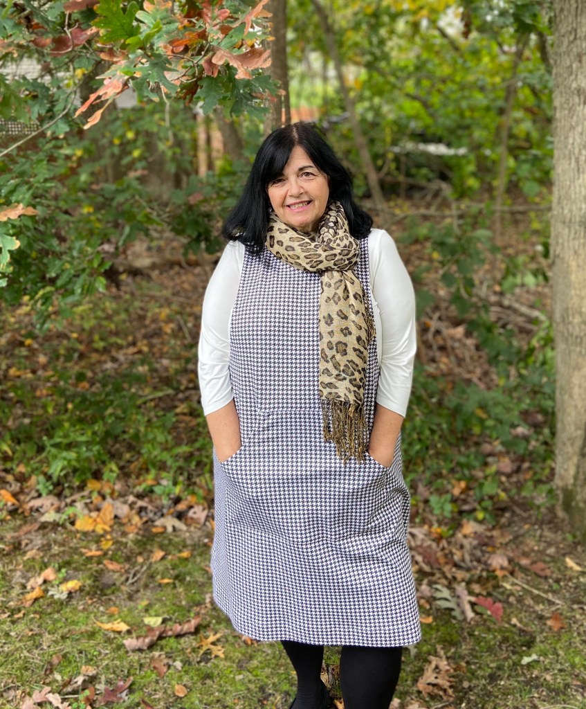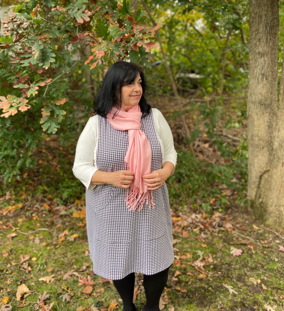 I really wanted a new York for fall, and I thought this beautiful Black, Brown and Cream Houndstooth Check Ponte would be perfect! RCF Ponte is a nice stable knit that is so easy to work with. It is thicker and more structured than other knits, but the stretch makes it so comfortable to wear. For this reason, I thought this Ponte would work for the York Pinafore. And I was right! You can find this awesome Ponte here!