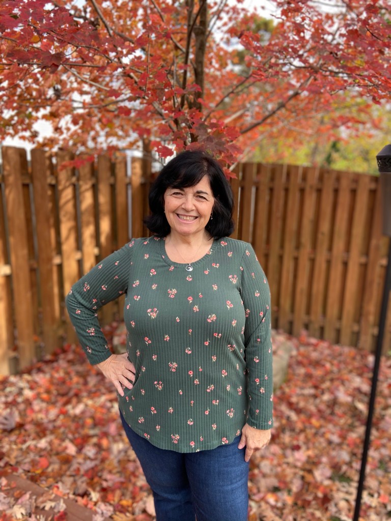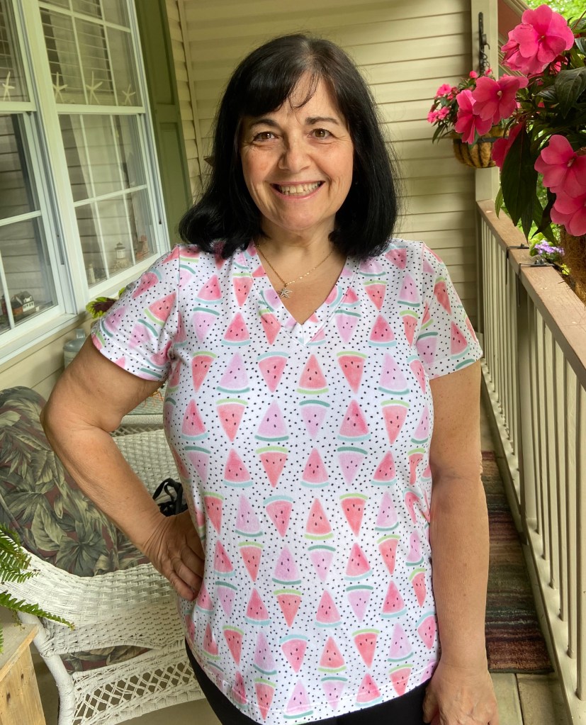 Over the past few years I have made many short sleeved versions of the tee, mostly v- necks. I always use the Full Bust pattern piece, shorten the length of the top about 2” and grade out one size for my hips.
