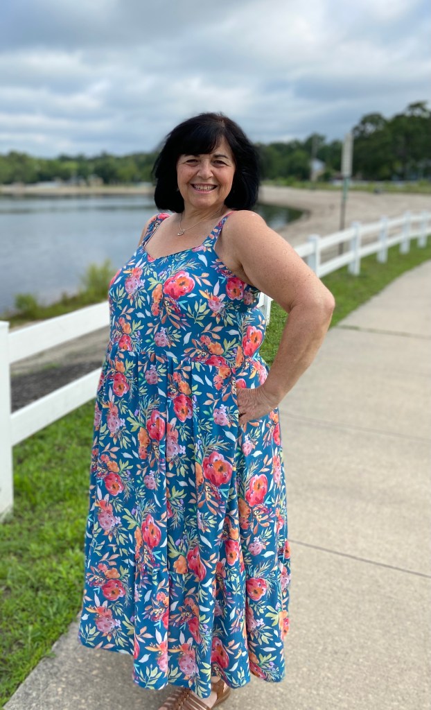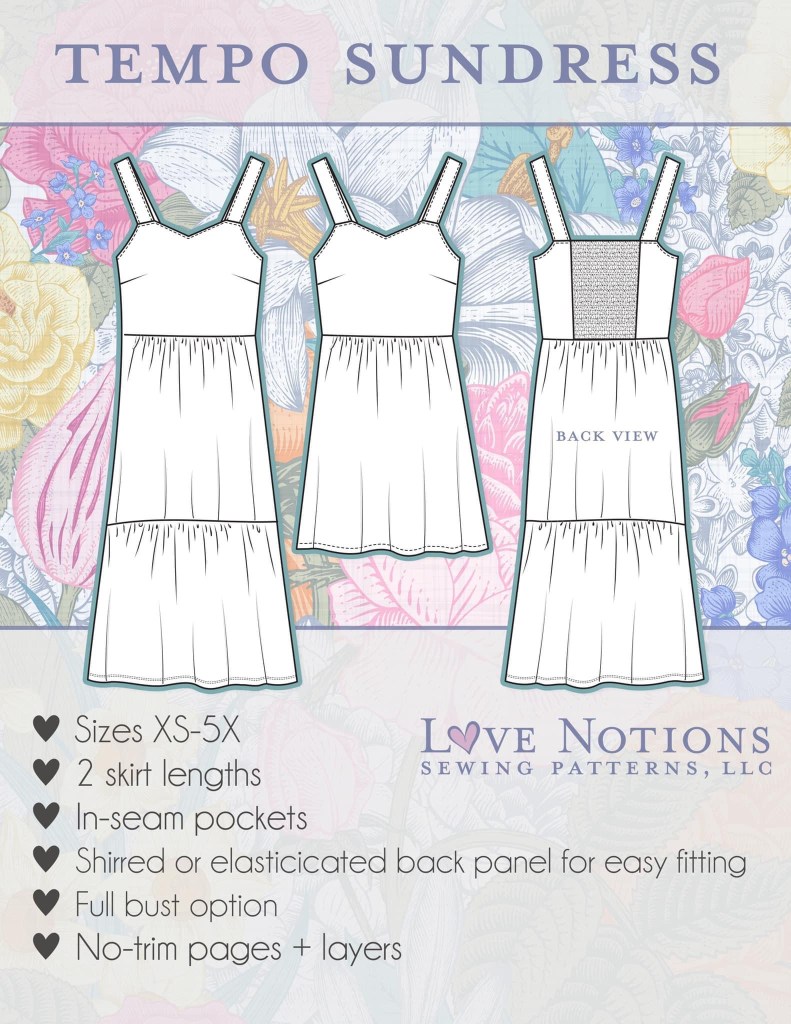 So here are the details. The Tempo dress is the perfect easy fitting sundress. It features a shirred back panel, which means no buttons, no zipper, you simply pull it on! It is available in sizes XS to 5X. There are 2 lengths, a knee length and a midi length. And the most important detail to me…the Full Bust option! I LOVE not having to make a full bust adjustment on a pattern!