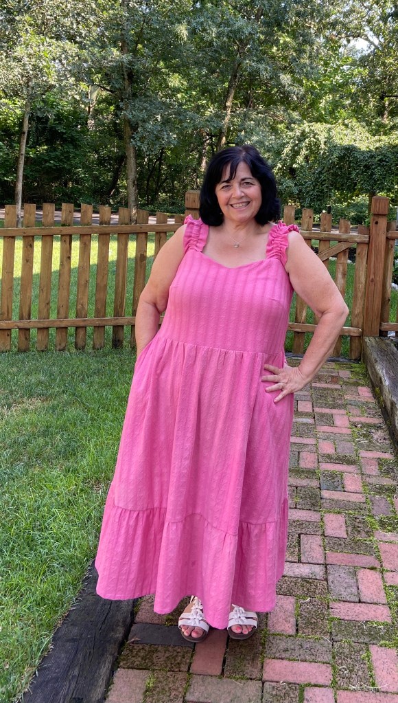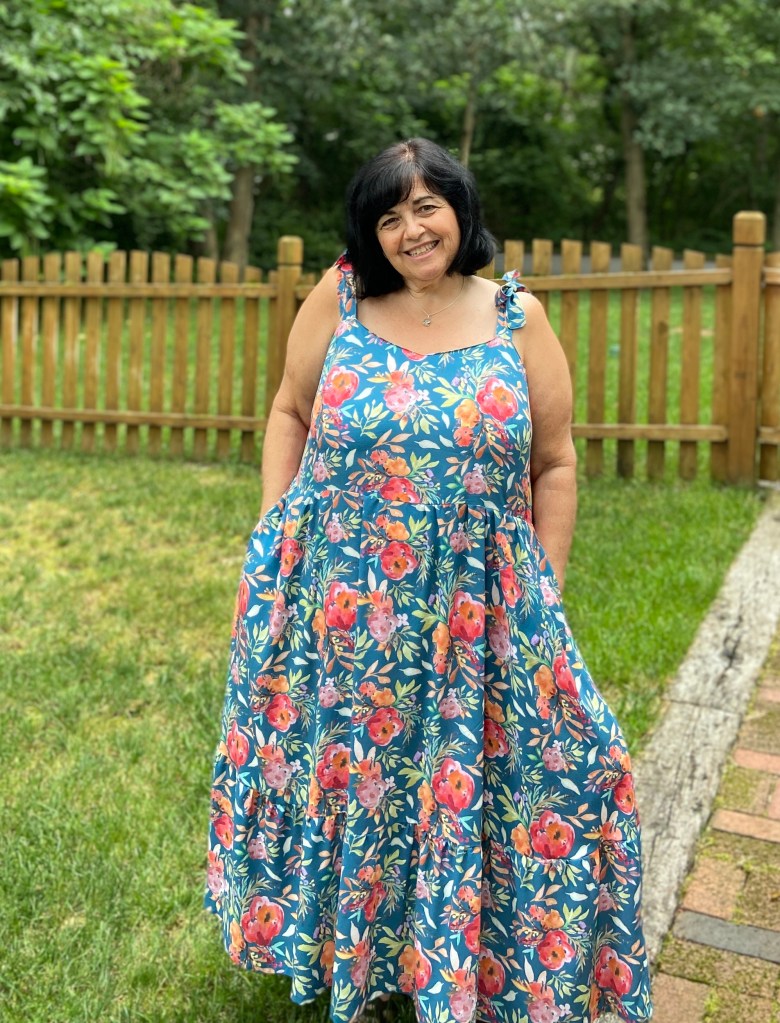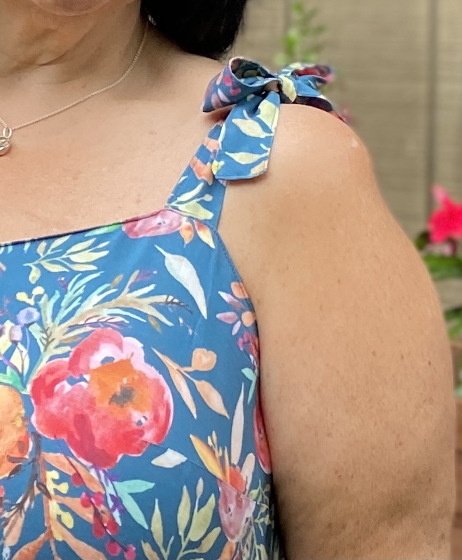 Ok, now lets be totally honest. As a full breasted women in her late 50’s I’m not always comfortable exposing my shoulders as much as this dress does. After decades of carrying around larger breasts, without all the great support bra options there are today, I have indented shoulders. I am pretty self conscious about them. Most people wouldn’t even notice it, but I do. Because of this, I did a small pattern hack to make me feel more confident in the Tempo. I made shoulder tie straps instead of basic straps. I feel the bow hides that indent that I hate! The other problem with the indent in my shoulder is that the basic straps were getting folded up/stuck in them and I was constantly adjusting them. I discovered this pretty quickly since after I took my photos for the release, I wore the dress all day!