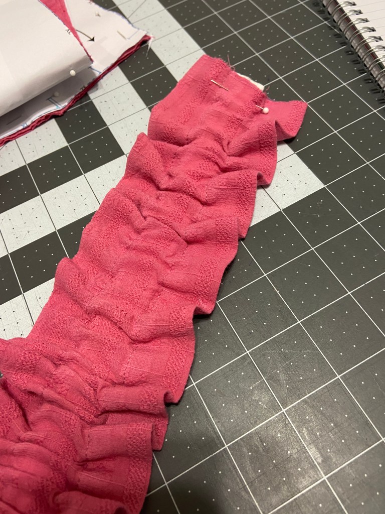 Determining the strap length: I started with the length of the strap for my size, which was 14″. The ratio I prefer for gathering is 1.75 of the original length. 14 X 1.75 = 24.5