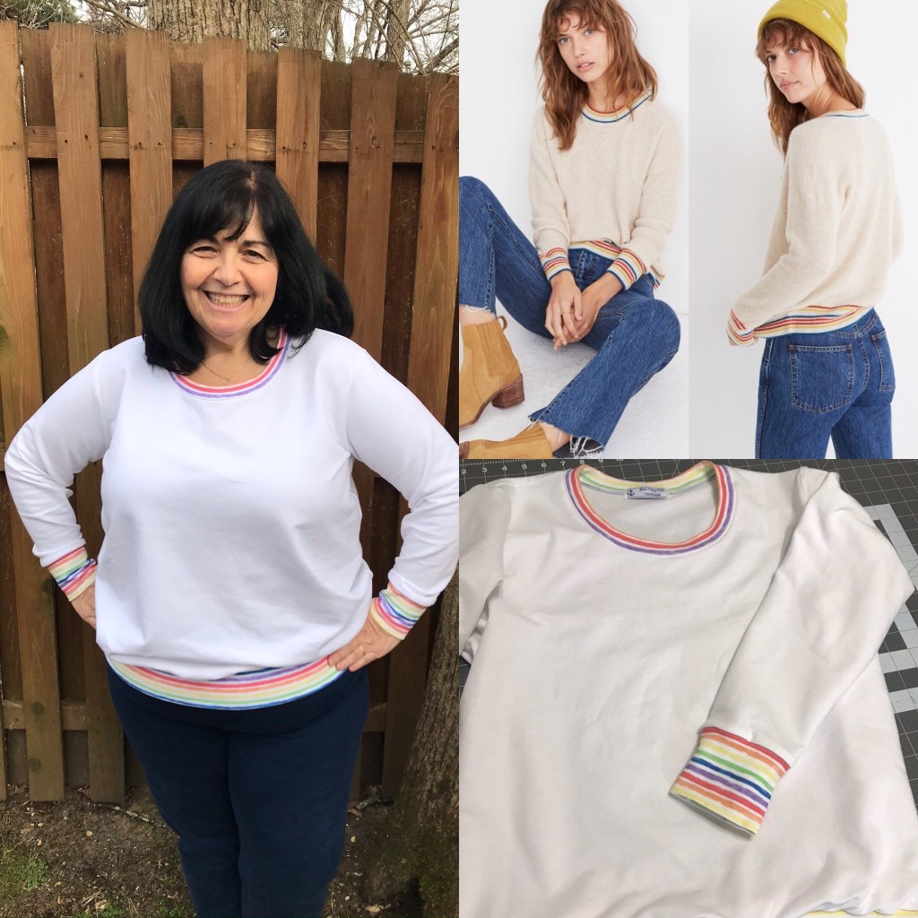 On the left is a sweater I saw at Madewell. Was I going to pay over $100 for a simple pullover I could make myself? Of course not!!! This was recreated by simply using solid white French Terry and a striped French Terry for the neckband, cuffs and waistband.