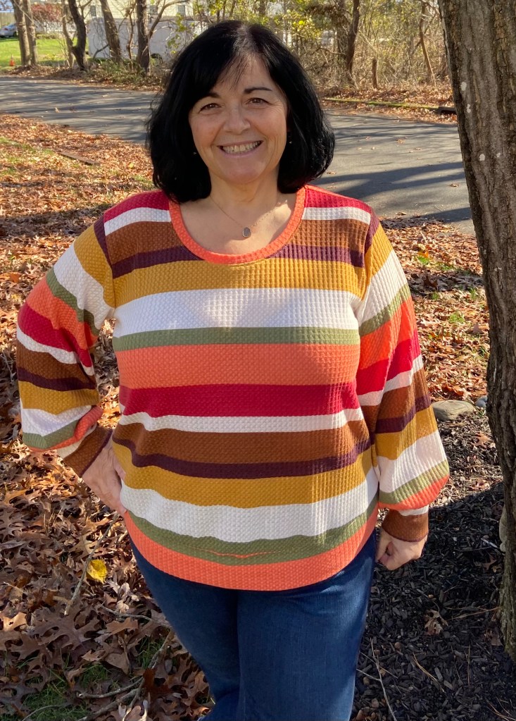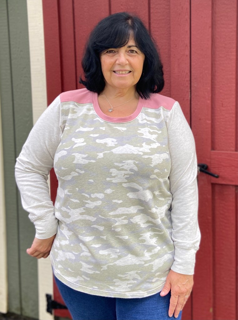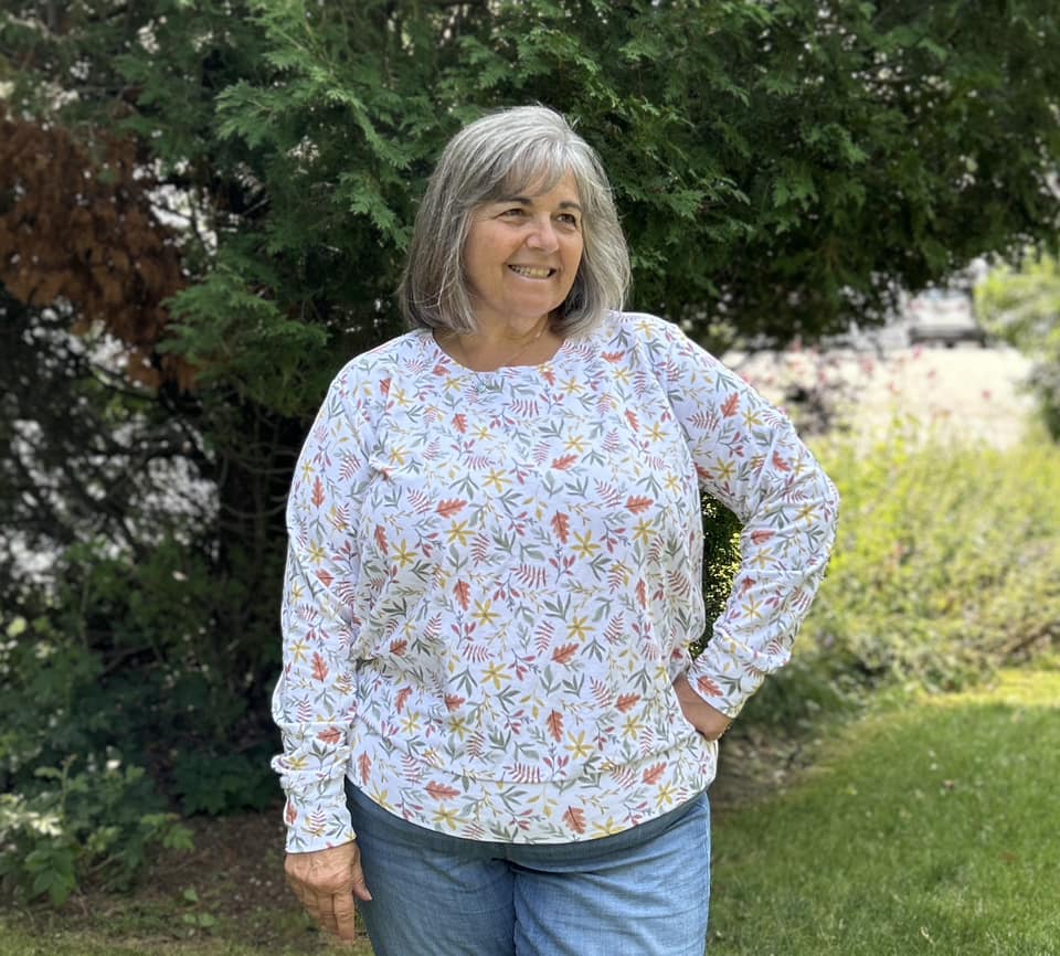This version of the Sloane Sweater is also very versatile. It does have a boxier fit- but it makes a great basic sweatshirt. View B is always my go to for a comfortable sweatshirt. Since I’m retired, I have been sewing up a very casual wardrobe. I wear these all Fall and Winter. I love wearing them alone or under quilted vests The three versions below are all made with French Terry, which is my favorite for this style.