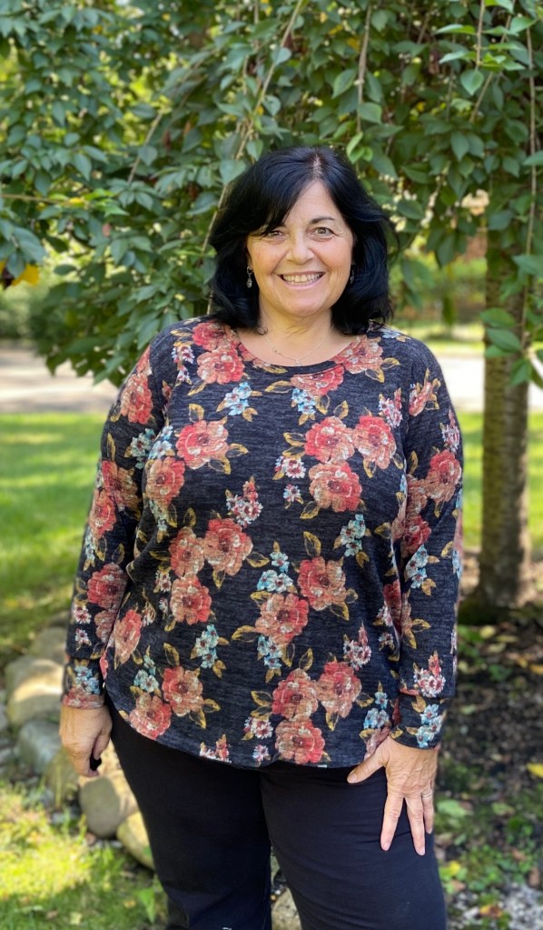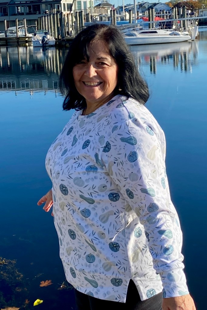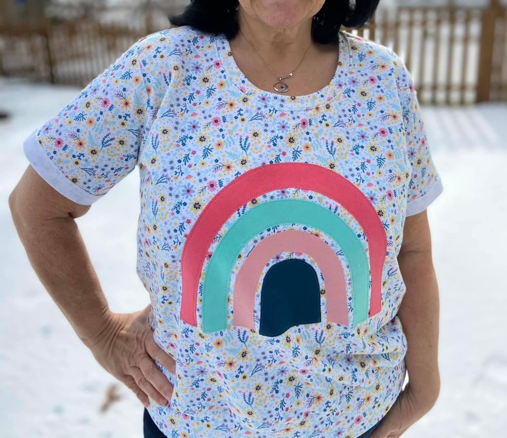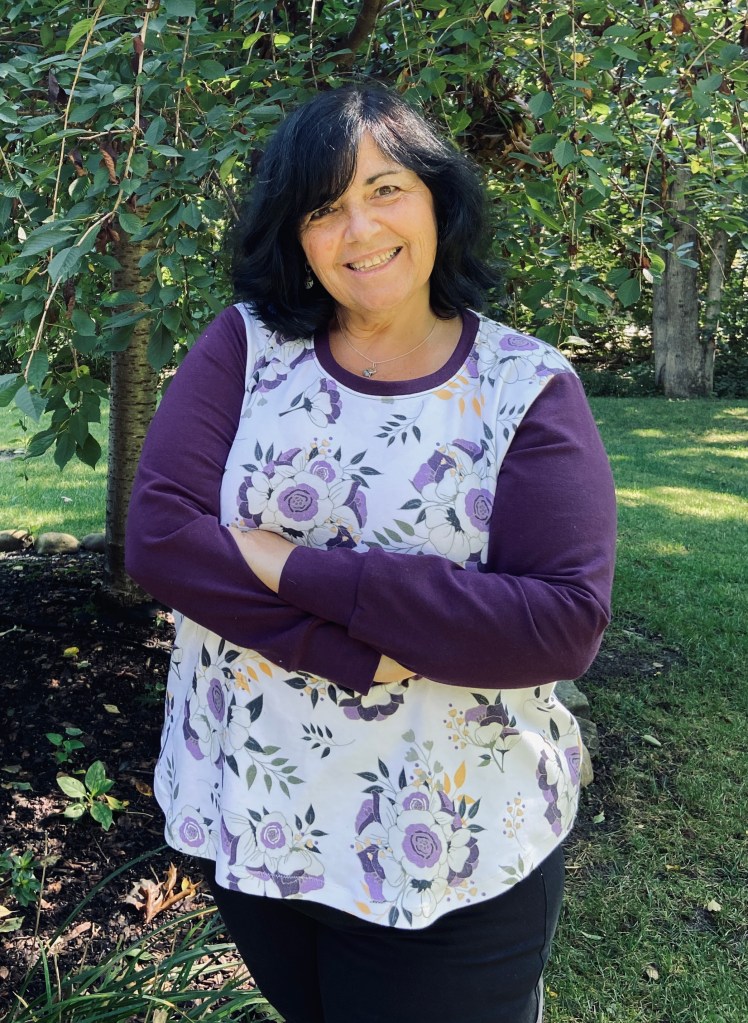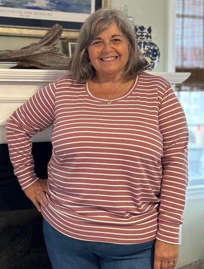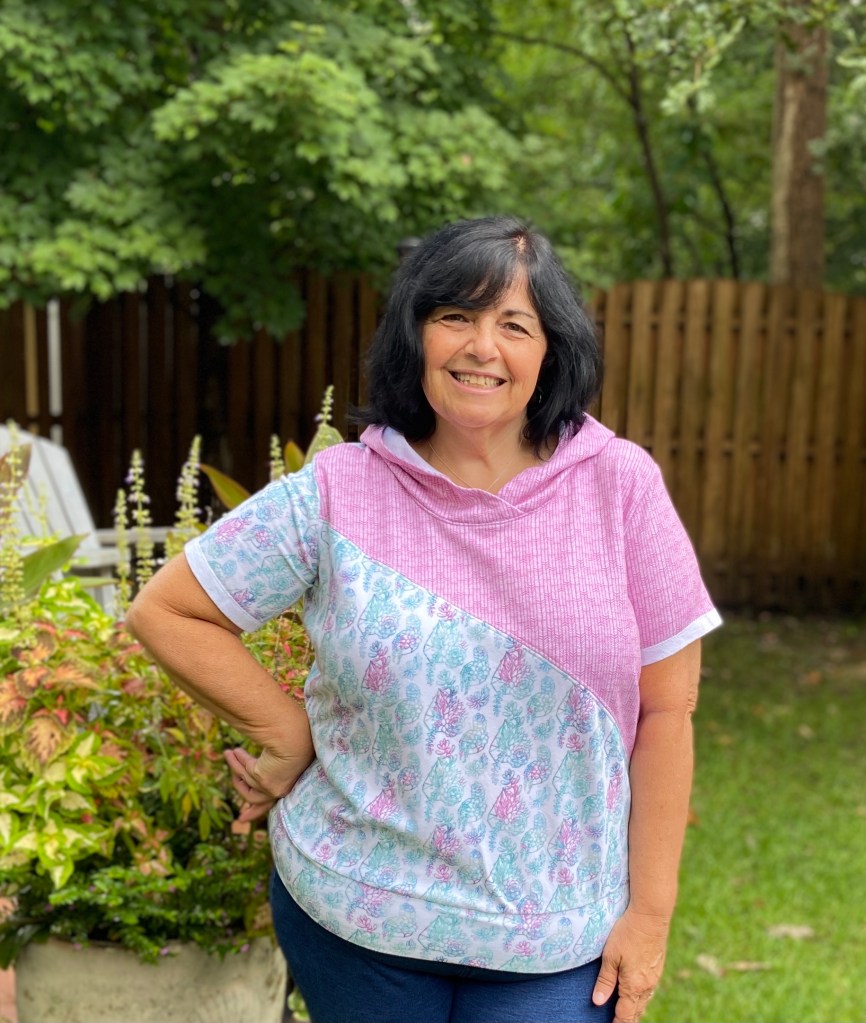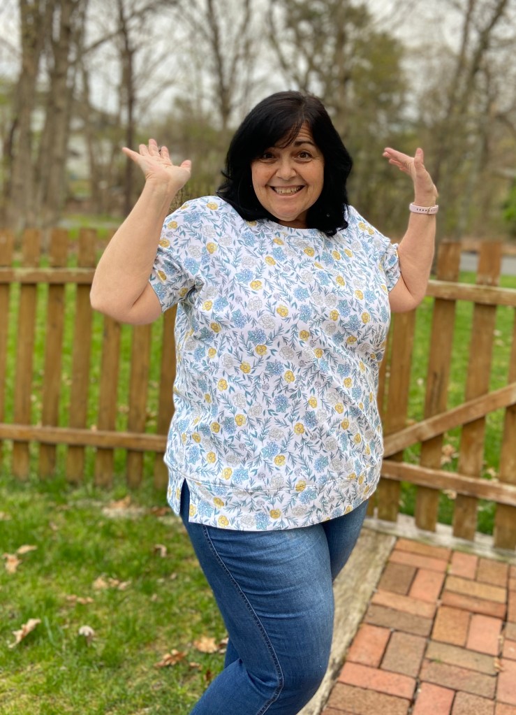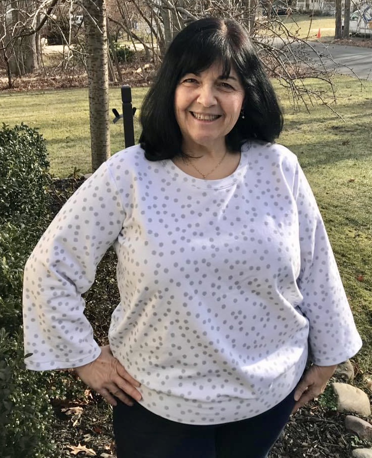 Over the years, my body has changed shape. All of these Sloanes still fit, but are much more fitted than then are in most of these photos. Now, when I sew up a new Sloane I start with the XL with the FBA. For View B, I do grade out to a 2X. So basically I have gone up one size. Below is an example of a Sloane made and modeled in 2021 along with the same Sloane worn in 2025. I will say I do like my Sloanes that are a size smaller for layering and tucking in!