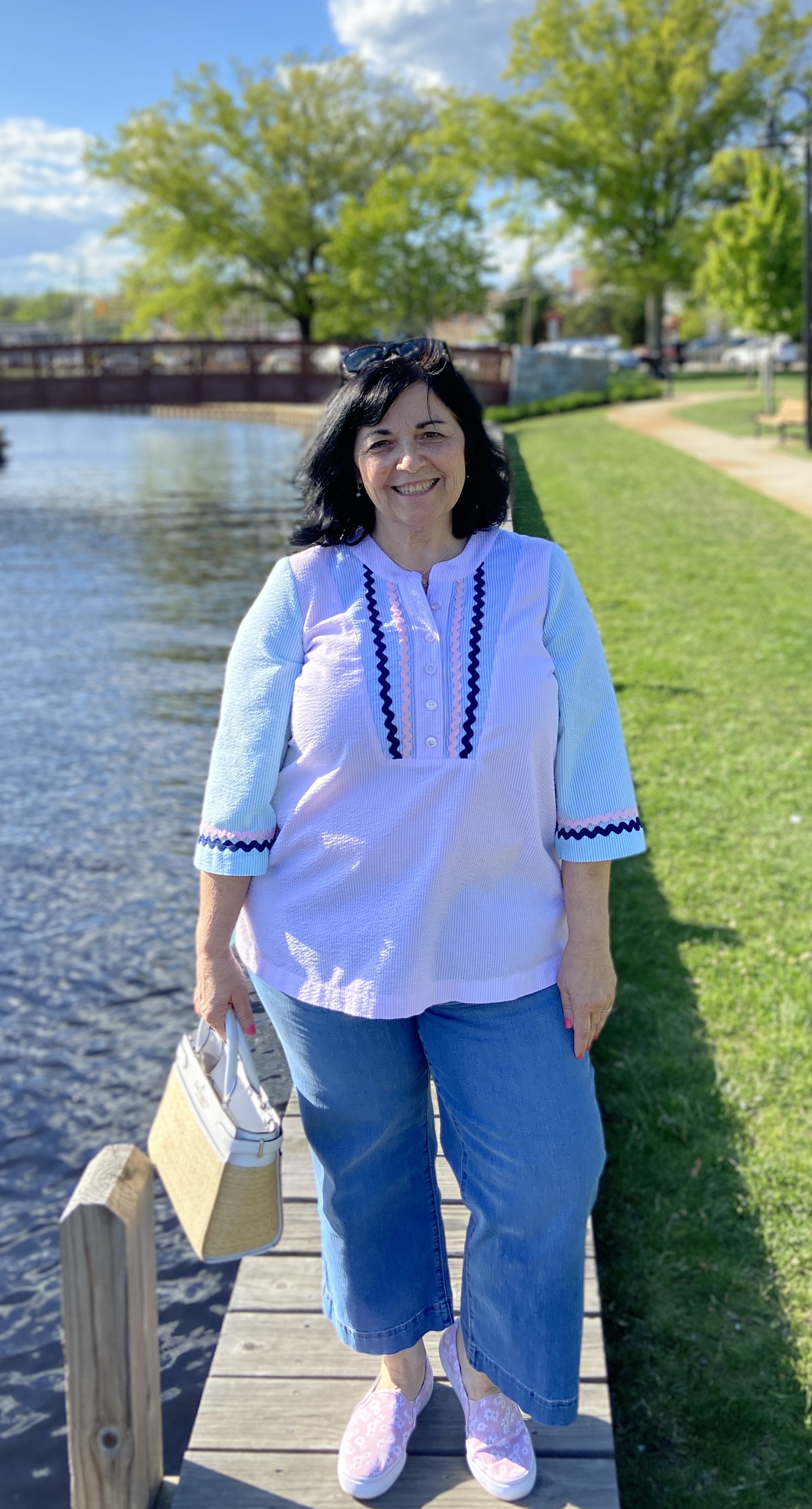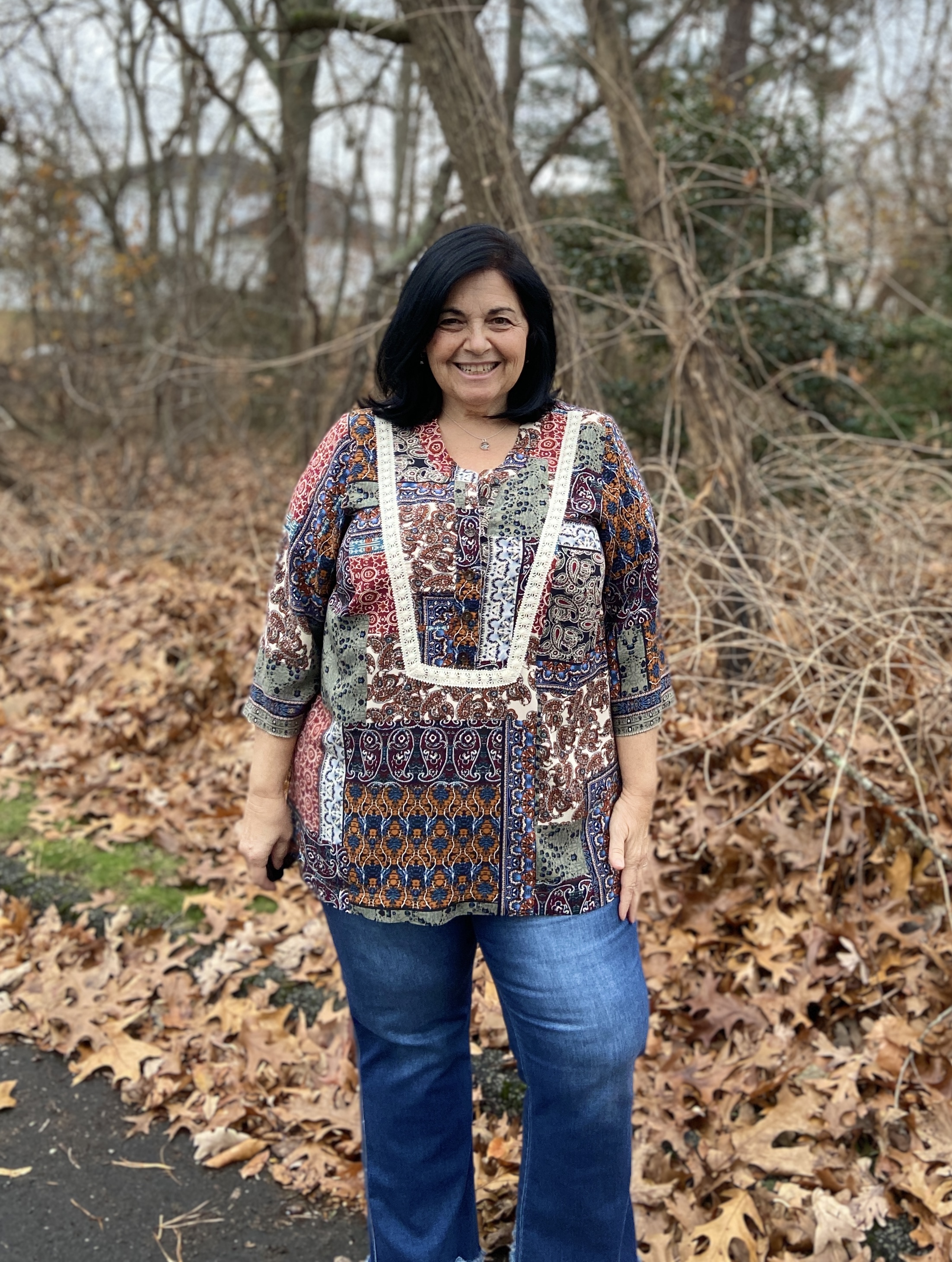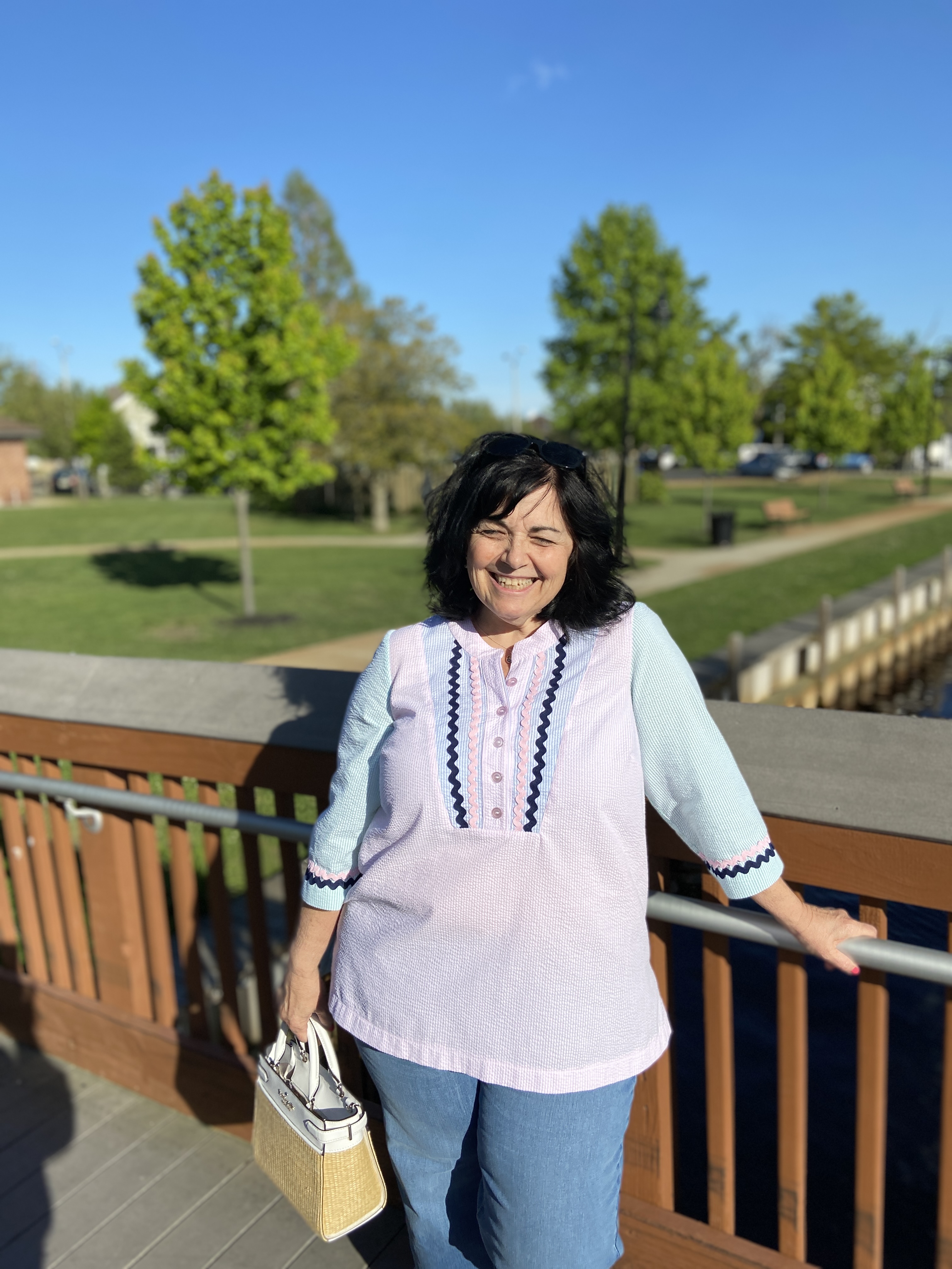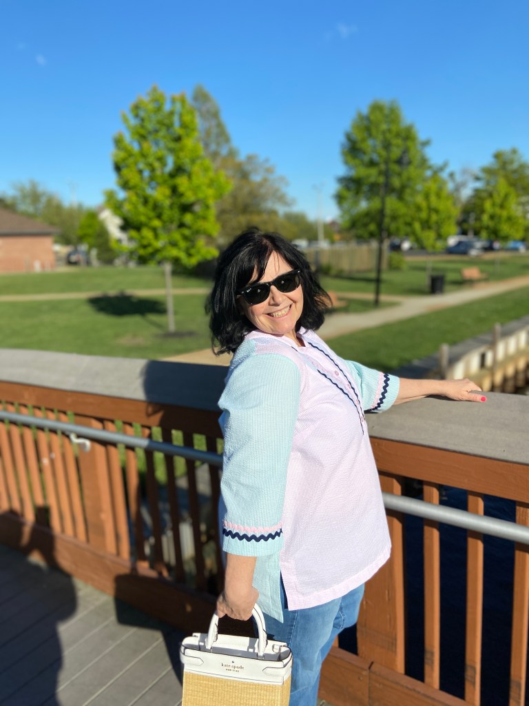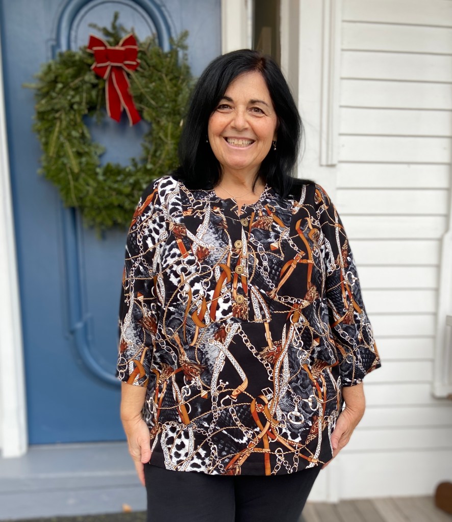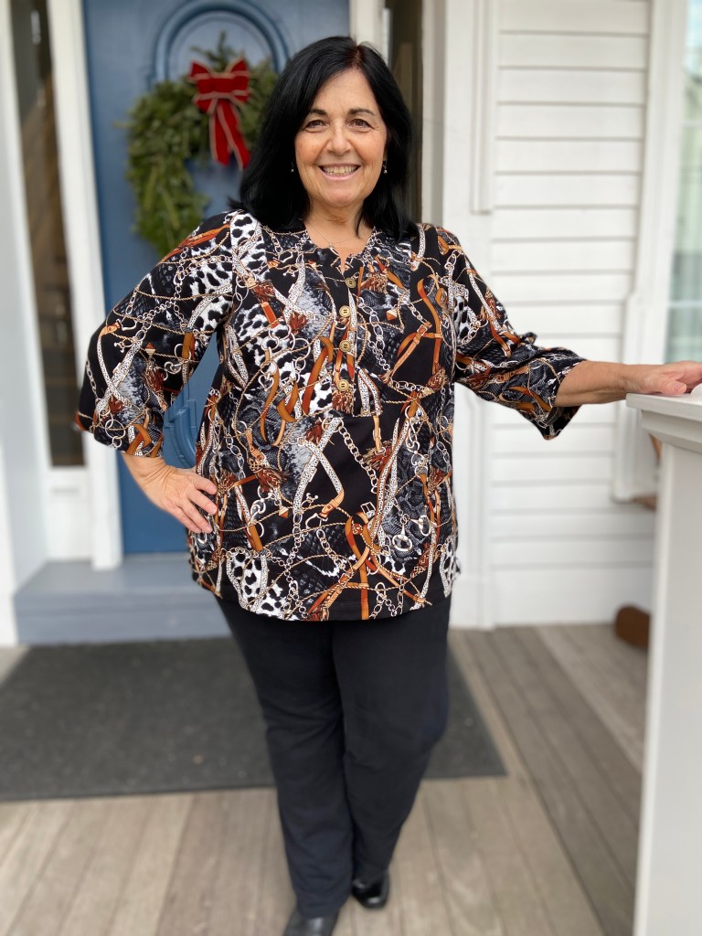 I sewed up my typical size for all LN patterns, which is a Large(with FBA) graded out to an XL at the hip. Remember if using the Full Bust piece, this adds 2″ to the finished waist and hip measurements. The back darts are optional, which I left off my newest versions to give myself a bit more room(I’m still dealing with a bit of COVID fluffiness). I have always loved tunics- but have never been able to buy them RTW. To fit my bust, the shoulders are always way too big. This is why I love LN patterns with the FBA front piece included. It gives me a perfect fit every time!