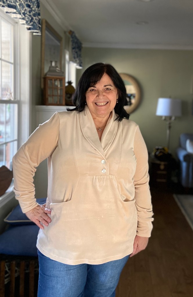 Last month I saw this stretch velour on Surge Fabrics Instagram page. I immediately ordered 2 colors! I one of them would make a great Whistler. This buttercream stretch velour is the softest ever and makes a dressier version~ even though I just wore it with jeans.