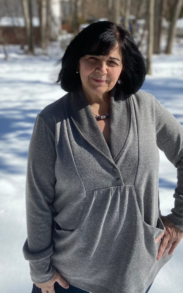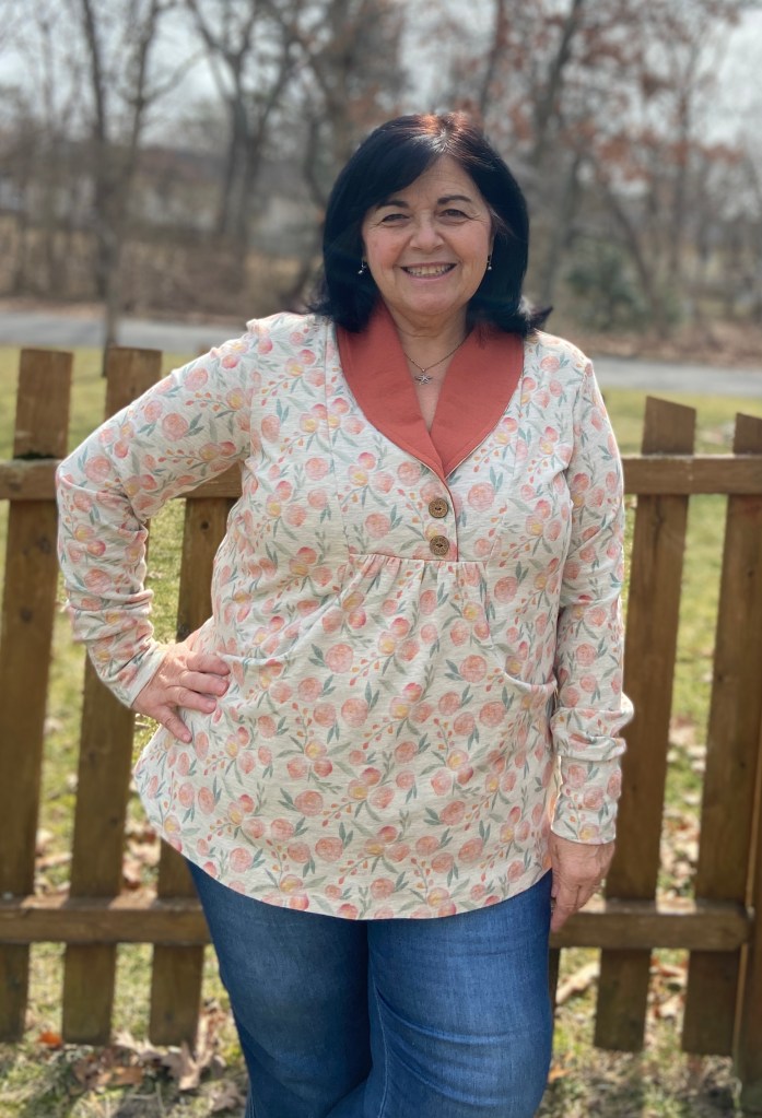 The options are endless! There are three lengths to choose from: top, tunic and dress. You can also choose between a banded hem or a straight hem. At the inset you can opt for a flat or gathered front.(All my versions have the gathered front). This sweater requires 2 buttons( functional or not- I just sewed mine through all layers).