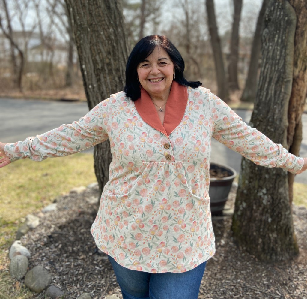 One of my most favorite fabrics ever is the Oatmeal French Terry from Raspberry Creek Fabrics. I decided a few weeks ago that I would stop hoarding it and get more of it sewn up. I made a Terra Tunic a few weeks back in the Palm Leaves~ you can see it HERE. I chose this Sunset Watercolor Floral Oatmeal French Terry and decided to use a contrasting Clay French Terry for the shawl collar. See below for fabric information.
