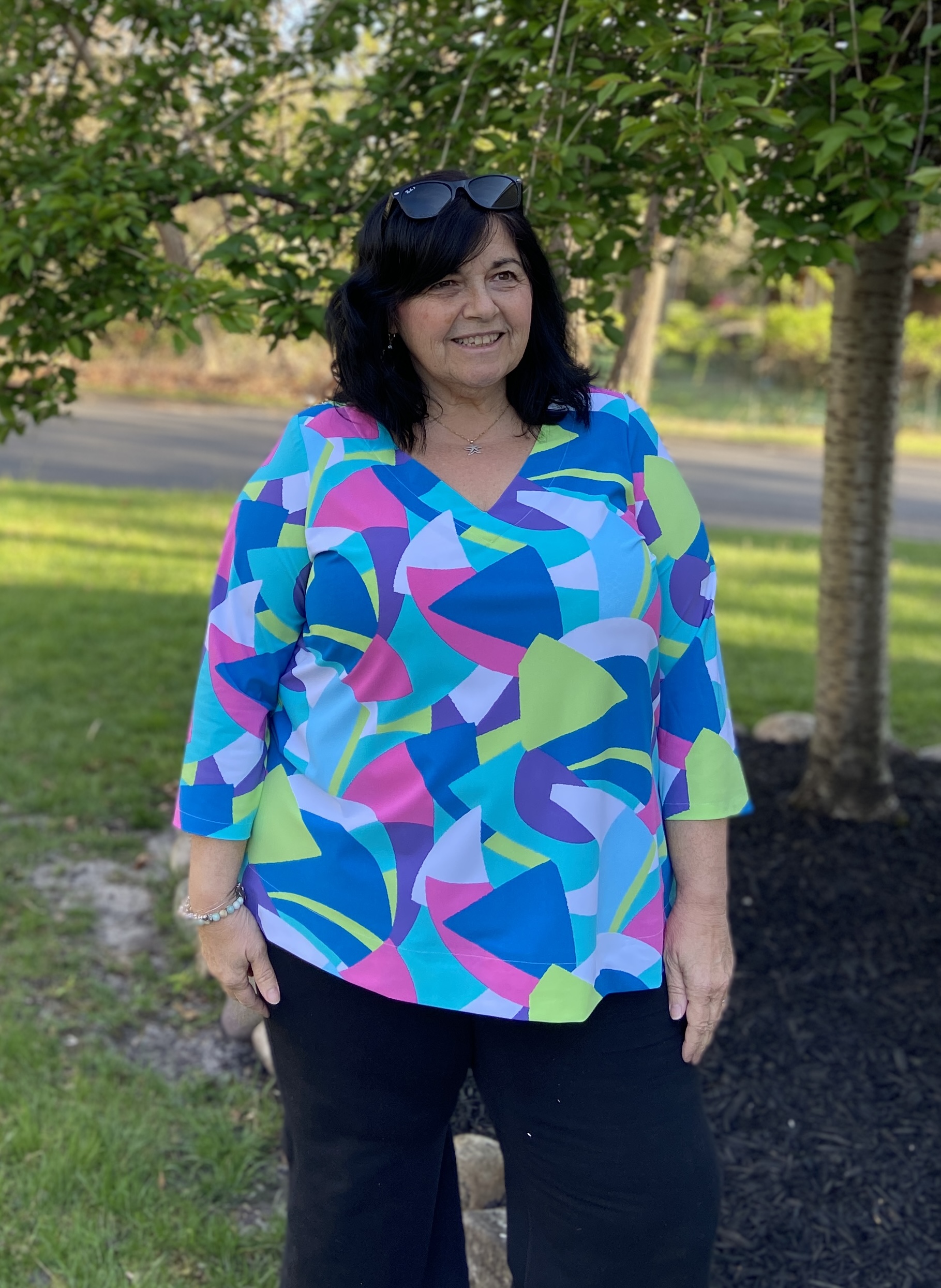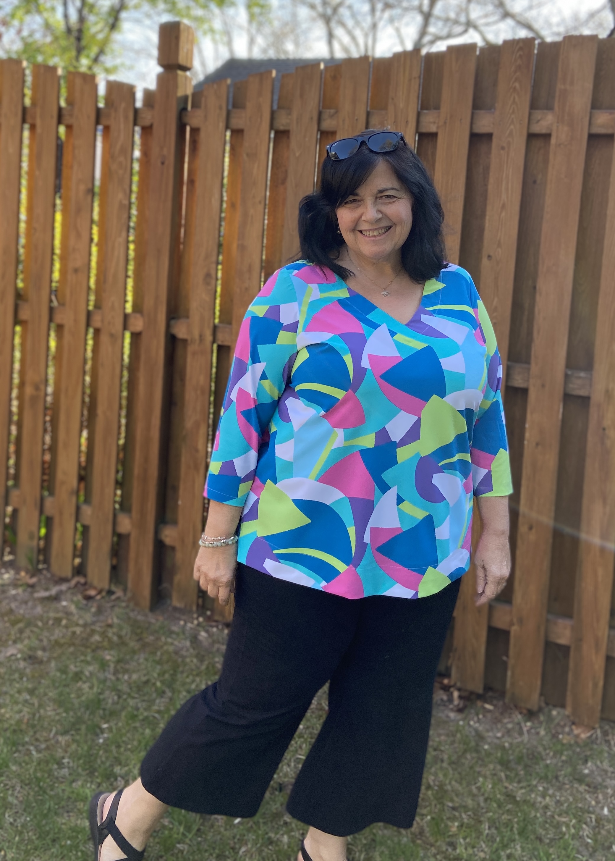 This is my tester version of a V-Neck Terra Tunic with facings instead of a neckband. I’m thrilled with how it turned out. This fabric is an ITY which I normally love, but this one was horrible to sew with! Im looking forward to making another one of these now that I know I like the look. Be sure to be on the look-out for it in the Love Notions Facebook group.