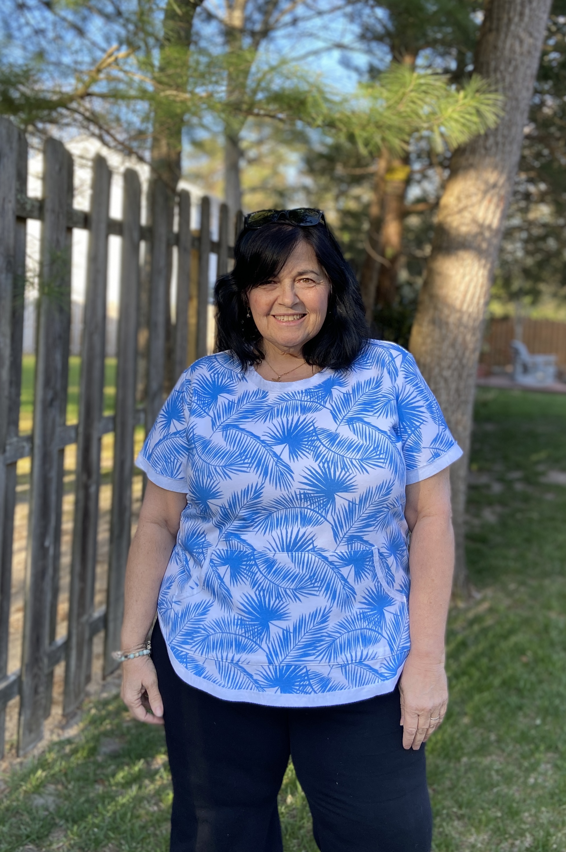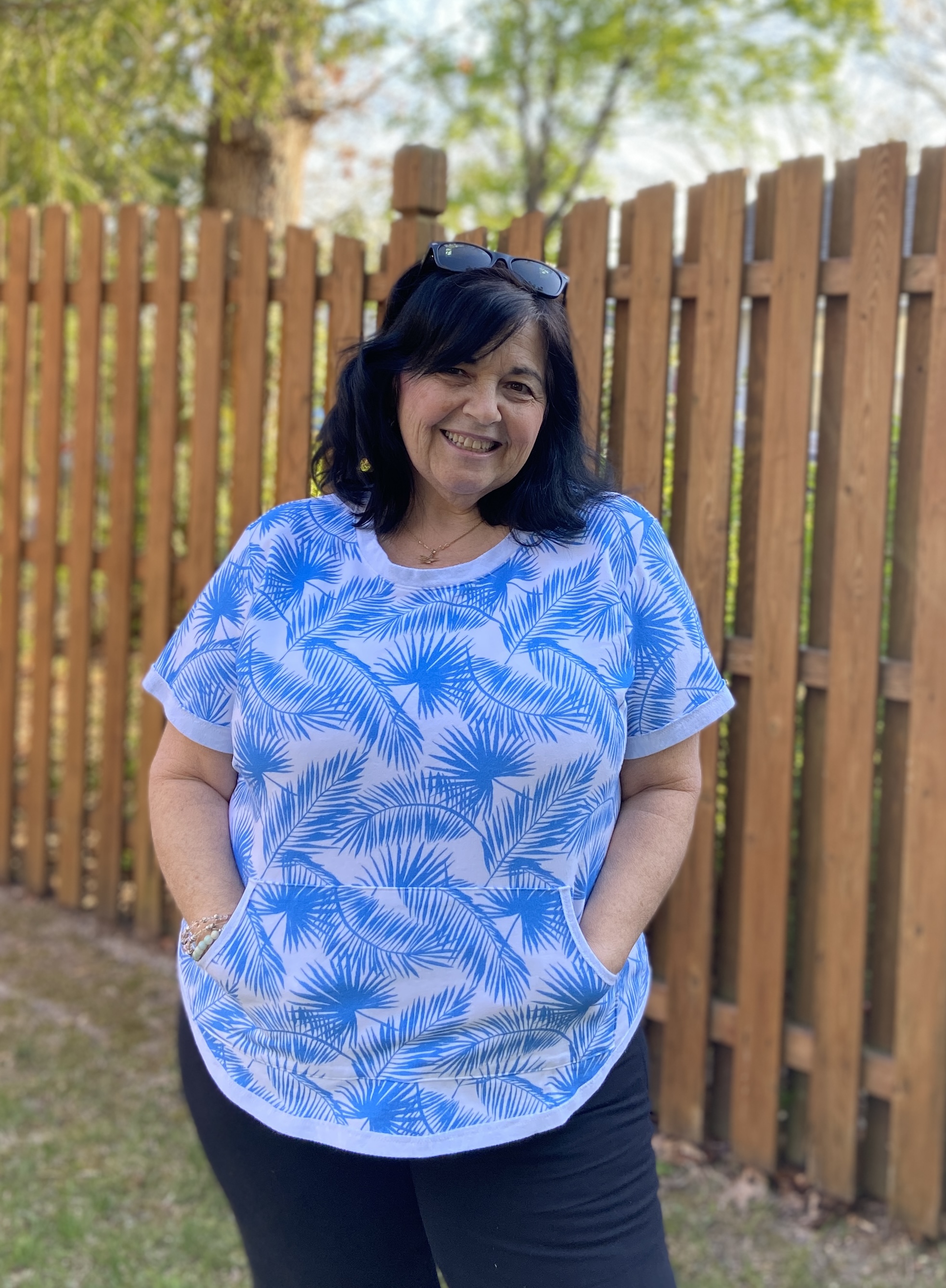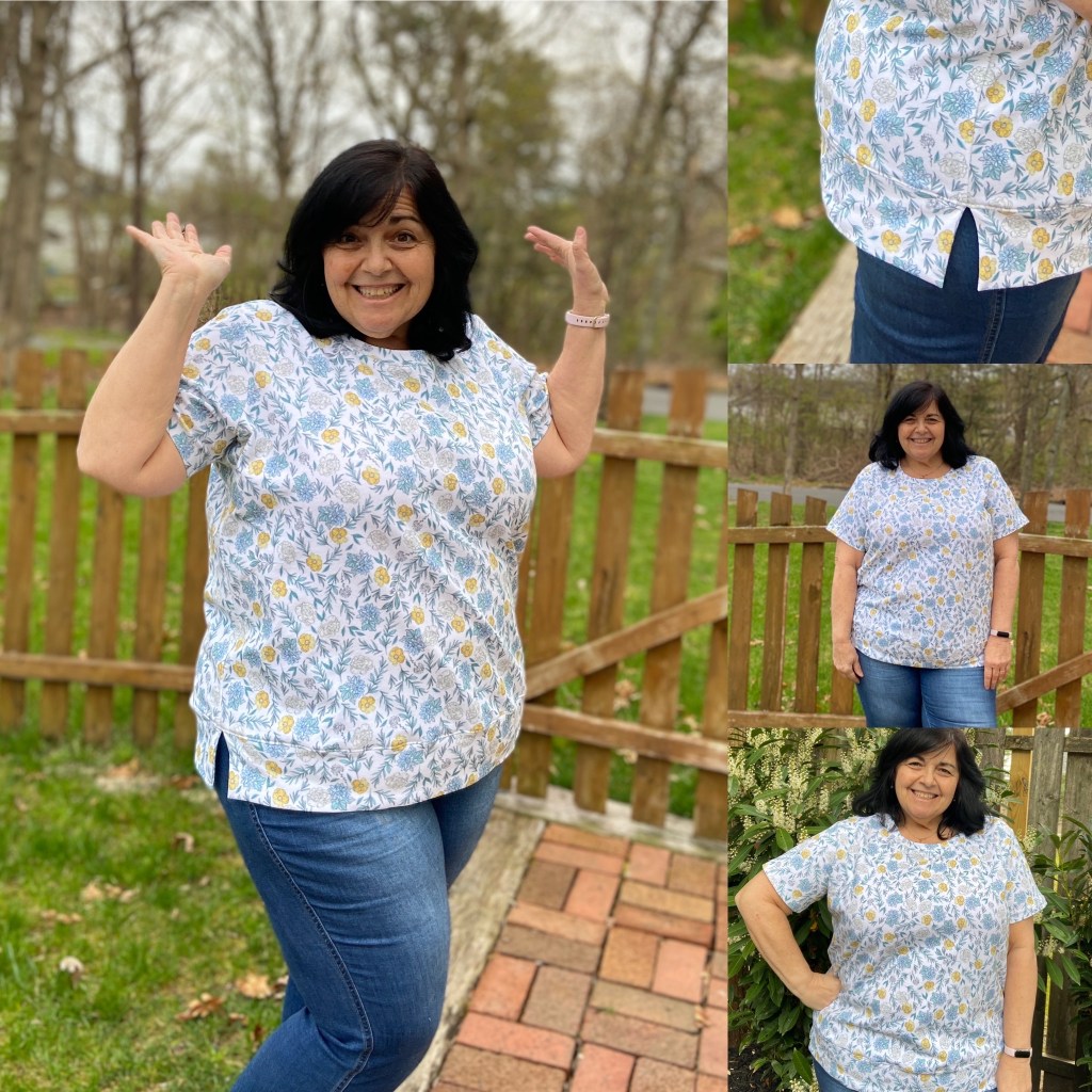This is Sloane (View B- Boxy fit) with a short sleeve. You can just fold up the pattern to the length you desire. My underarm seam is about 5″ long. I typically make the sleeve longer, and then decide once I have the top on. I have also created a split hem on this version(which I might do on all my Sloanes now!)
