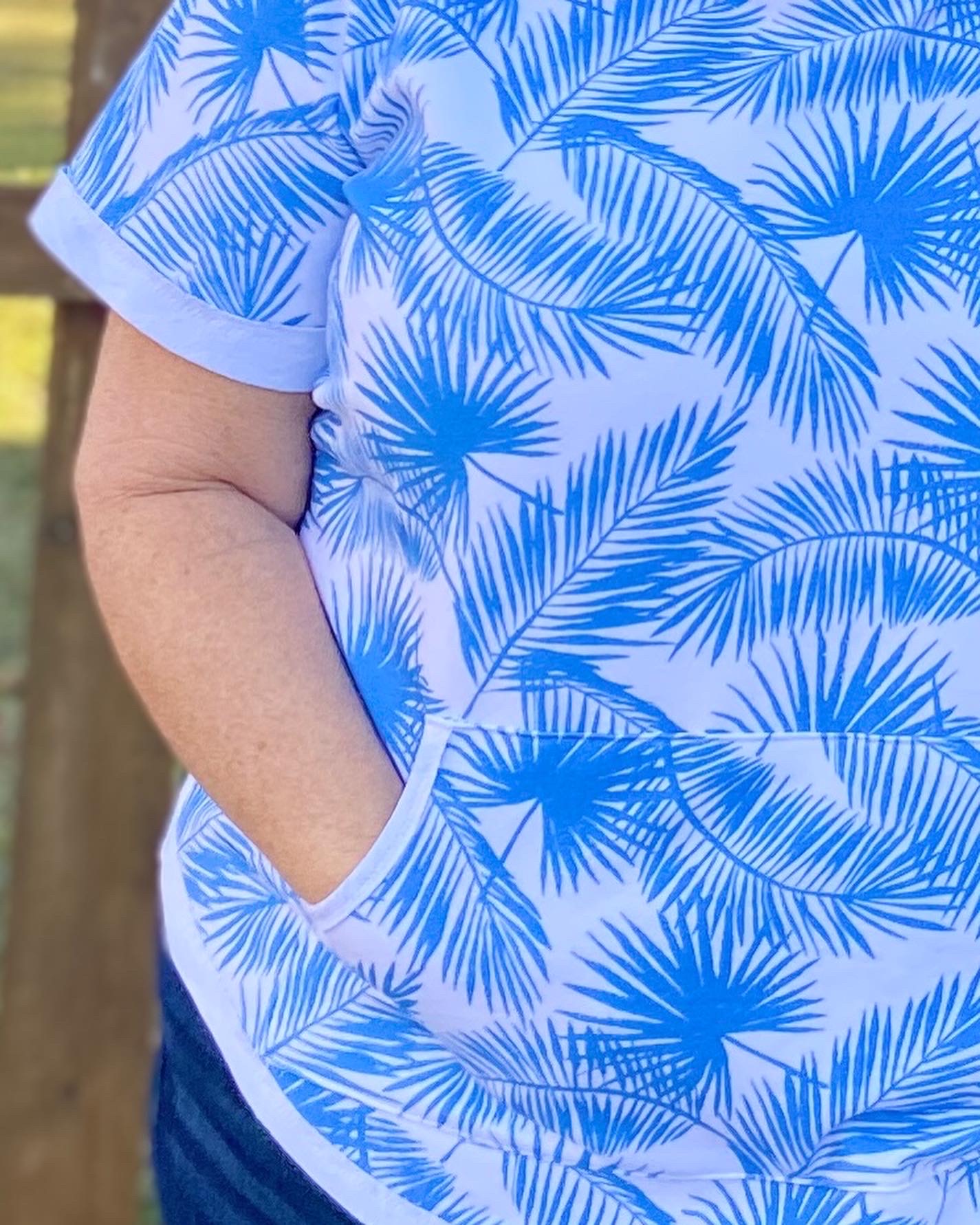 This is the View A body which is more fitted with a curved hem. I’ve shortened the sleeve on this as well for Spring/Summer. To add some interest, I simply turned the sleeve and bottom hems to the outside and stitched in place. The neckband is also made using the reverse side of the French Terry. When finishing the pocket edges, I again, turned the wrong side to the outside and stitched. This gives it a more casual and beach feel, which is exactly what I was going for.