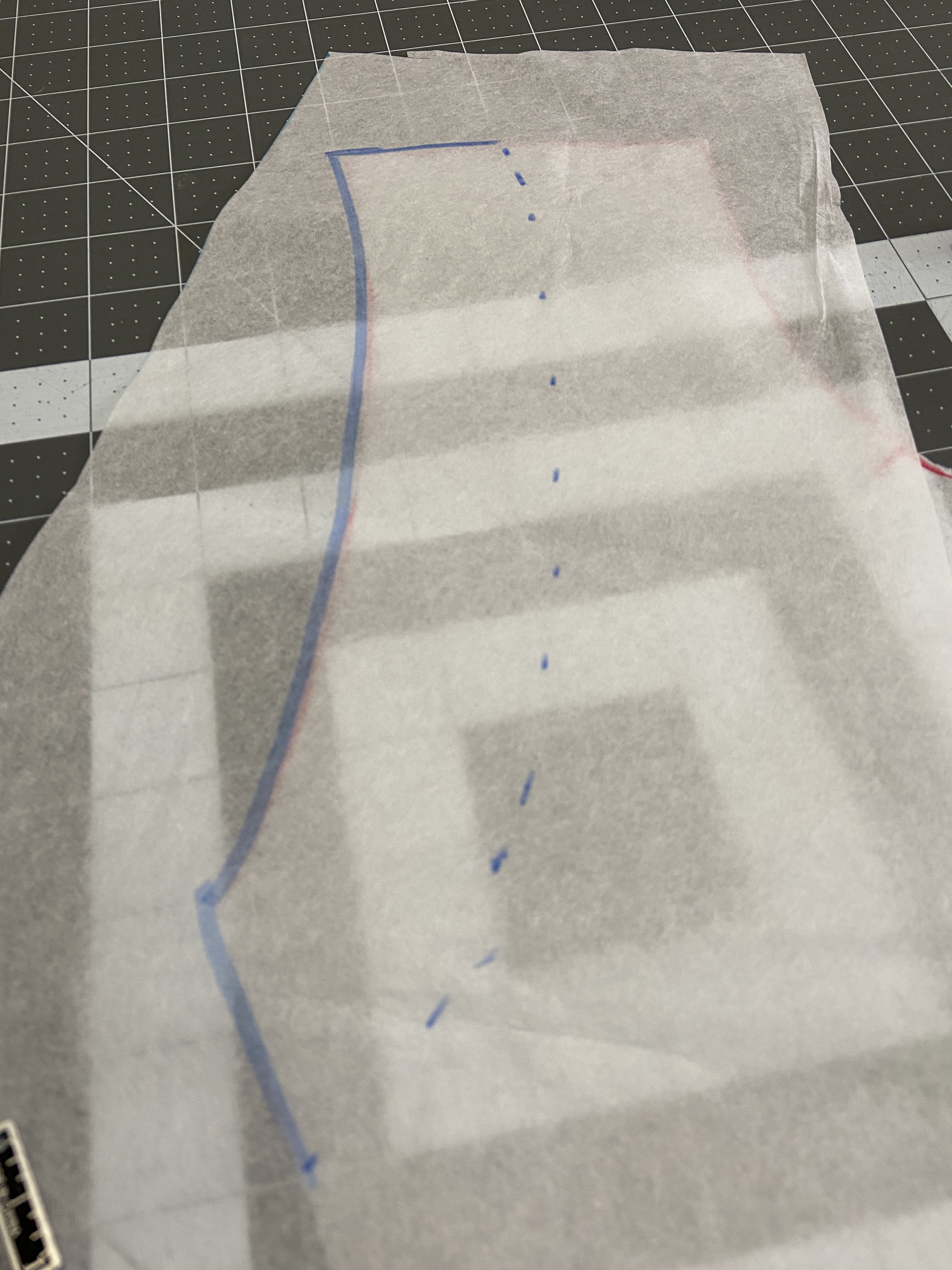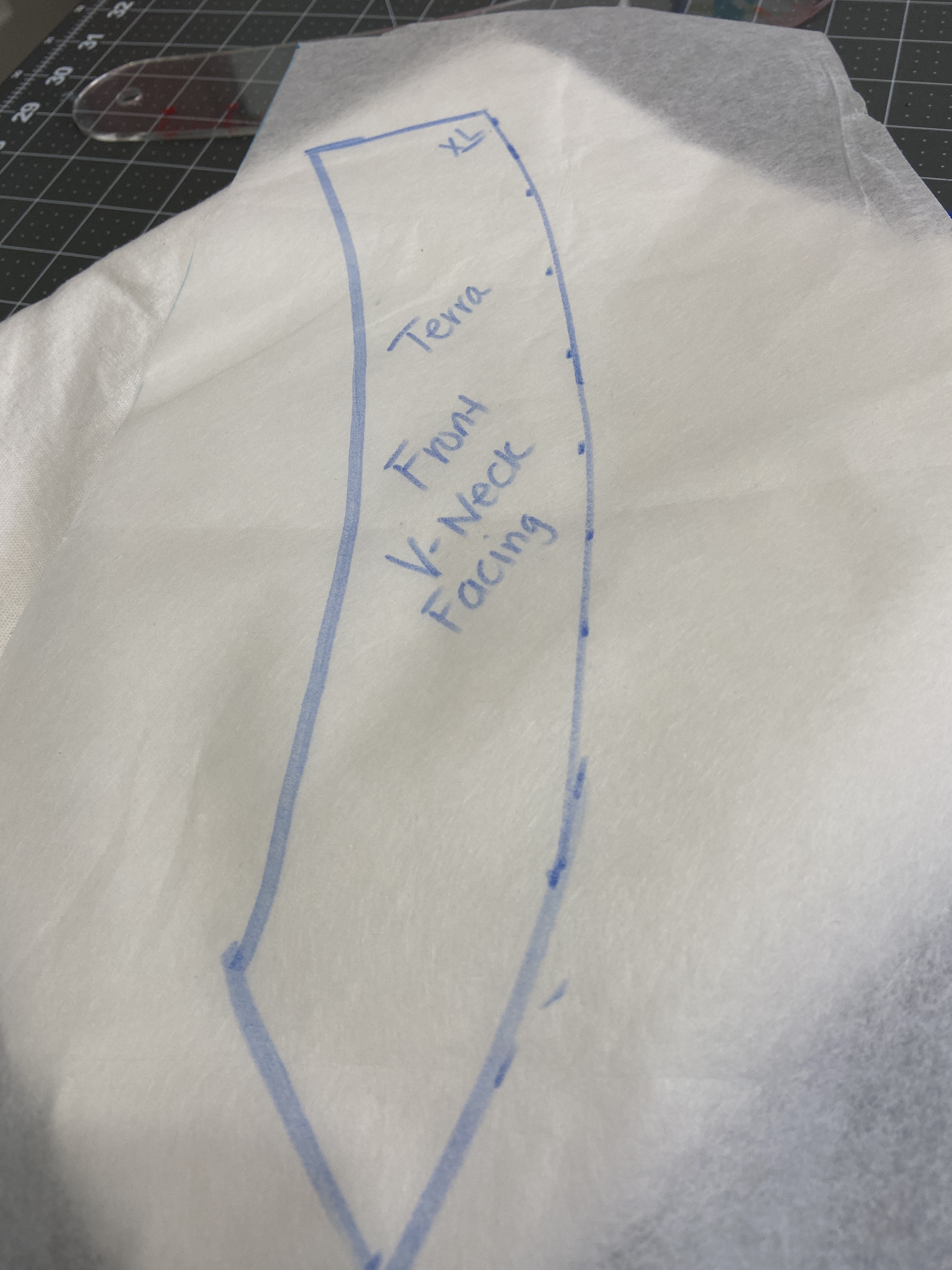 - Take your front body pattern piece, place a piece of pattern tracing cloth(I use Pellon Easy Pattern 830) on top and trace the v-neckline, shoulder and center front.