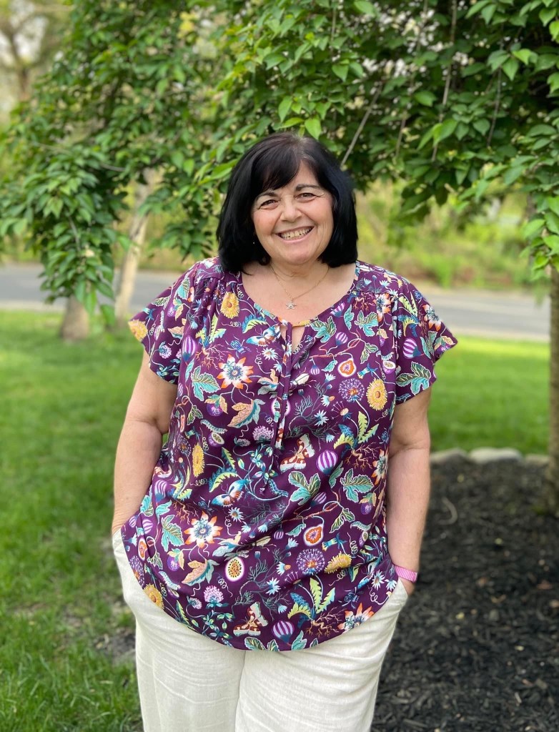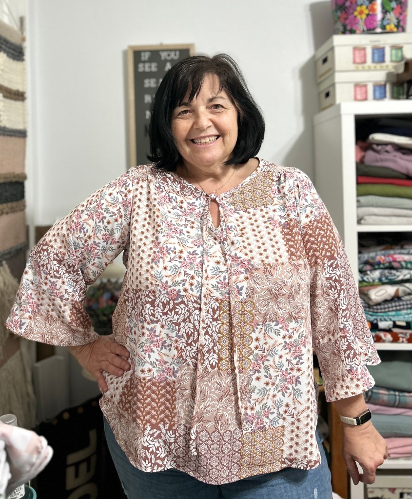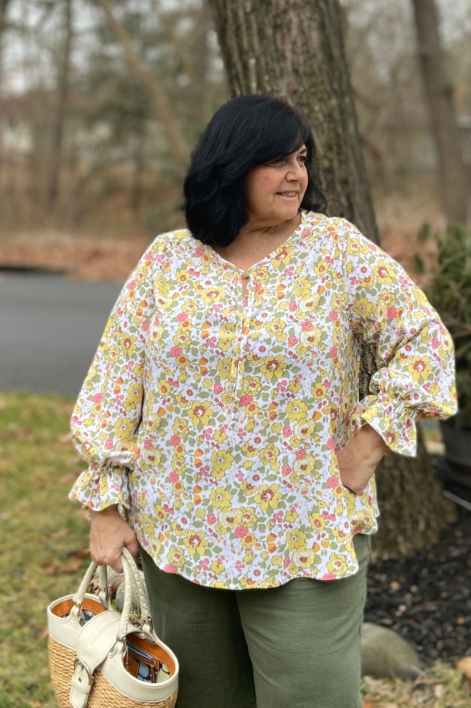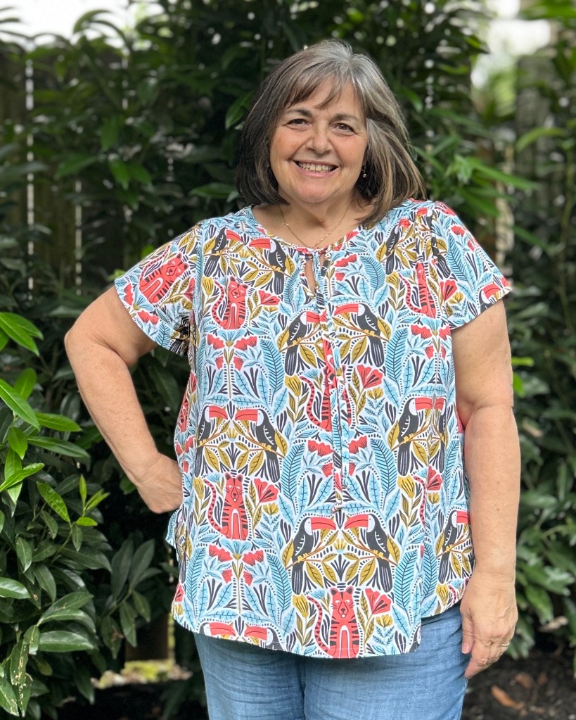 Remember to choose your pattern size according to your high bust measurement. It’s important to do this so you can get a good fit across your shoulders. If you are in-between sizes, make sure you size down. This is a relaxed fit blouse and if you size up you might find it too big in the neck and shoulder area.