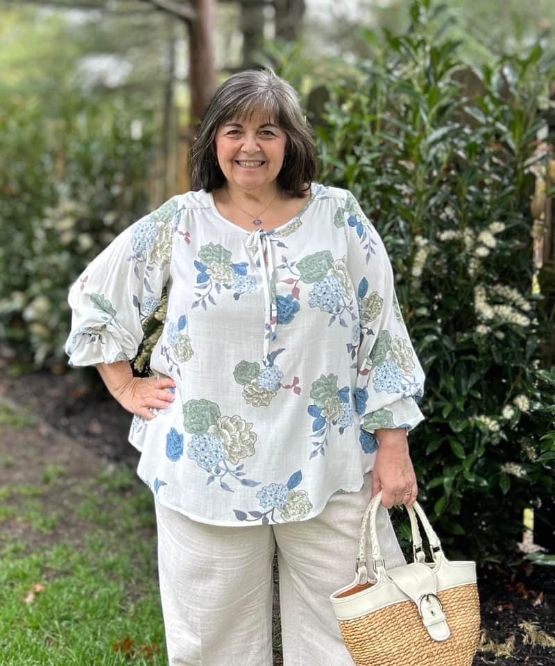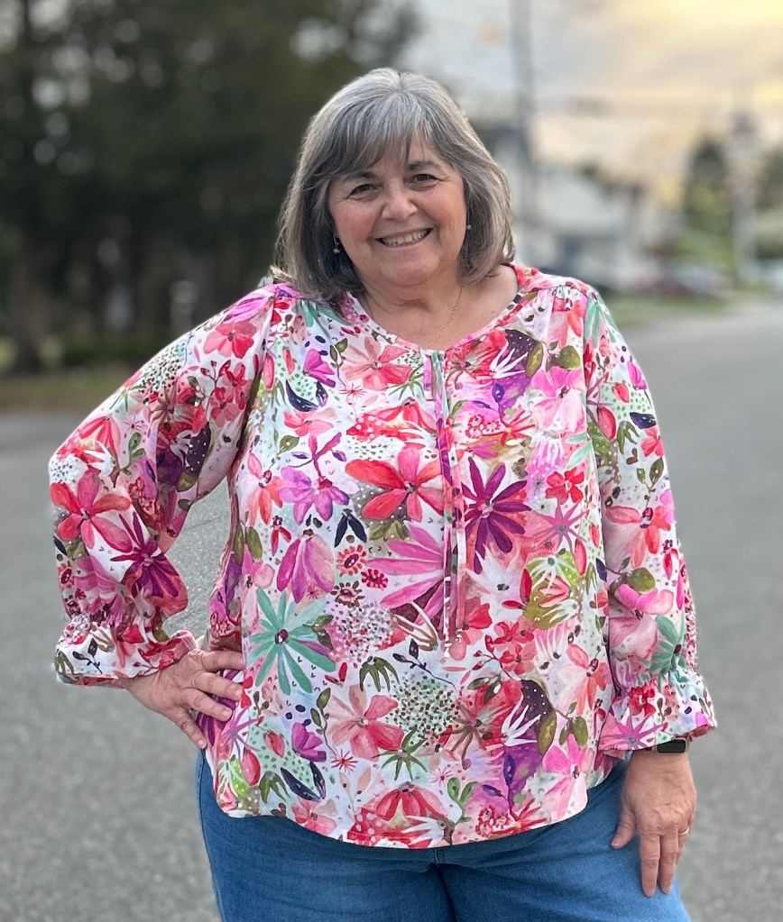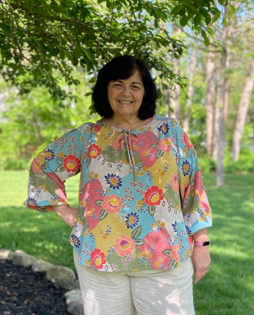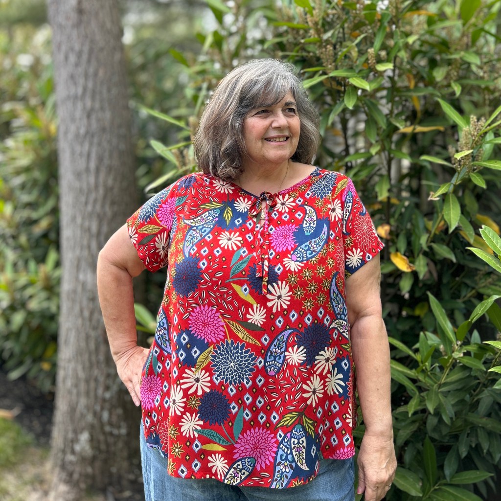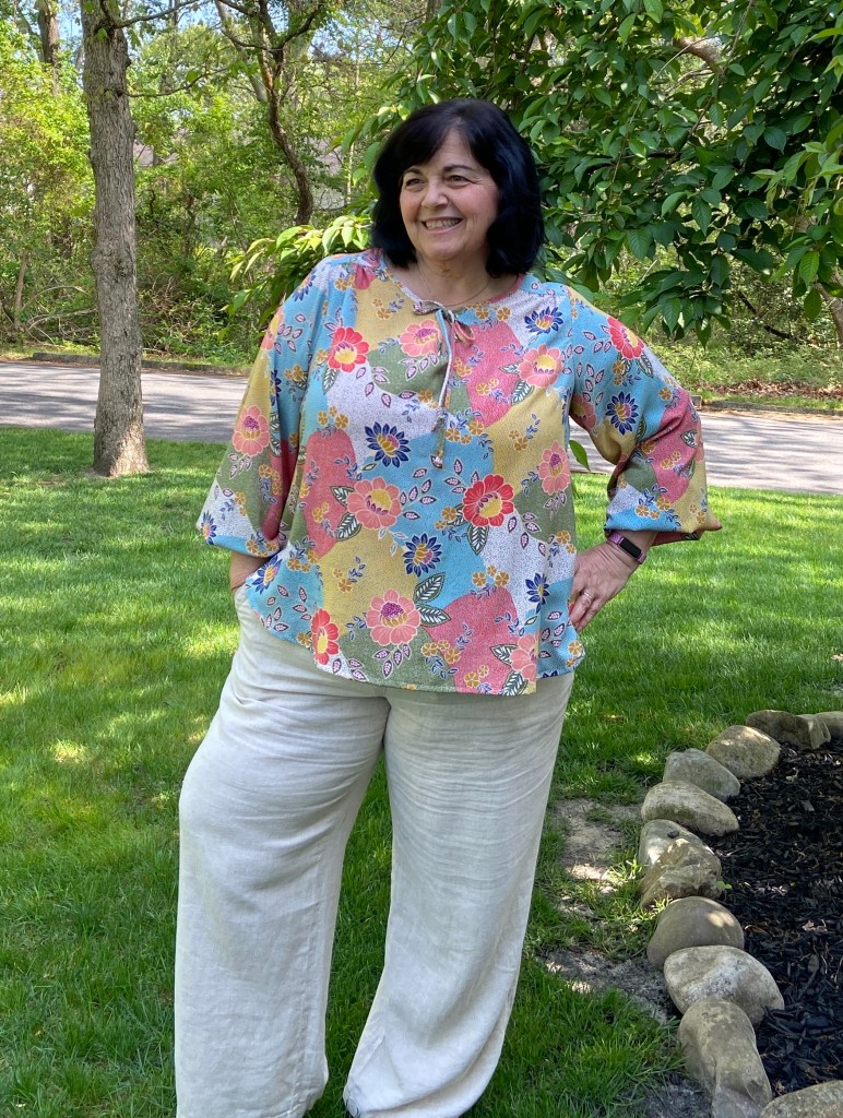 The Rhapsody made with the 3/4 sleeve and flounce is a great transitional blouse. (or perfect for air conditioning in the summer). It’s important to check the sleeve length of this before you attach the flounce. I shortened the sleeve portion of this view 2″. The patchwork version is a polyester crepe from Alyssa May Designs. This print is no longer available, but she has a beautiful selection of fabrics at great prices!! The blue and white is a rayon crepe from Style Maker Fabrics. The bold floral is a newer fabric base called Air Flow. This fabric came from Mily Mae Fabrics and is no longer available. Raspberry Creek Fabrics carries this type of fabric as well.
