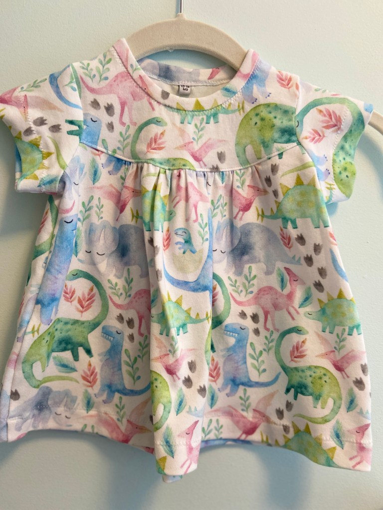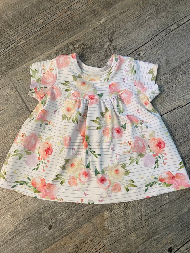 - Be sure to attach and sew the neck binding on with a zigzag/stretch stitch. You need this to be able to stretch over the little’s head! I sadly have found that some children’s patterns (from other companies) are hard to pull over a baby/toddler head sometimes. True story~ I have a large teddy bear in my sewing room that I always test neckbands on before attaching!
