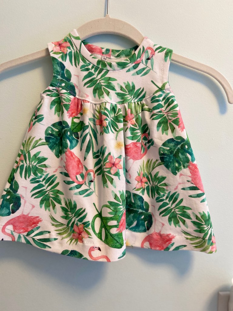 I made Vivi Lou the 18 month size. Vivi was between sizes, however I did go with the larger size, so that she could continue to wear these into the Fall. I highly suggest making one in scrap fabric first to try on for size. I used fabric left over from the layette I made her last summer to test for size before I continued. Her mom and I were very happy with the fit of the 18 mo.