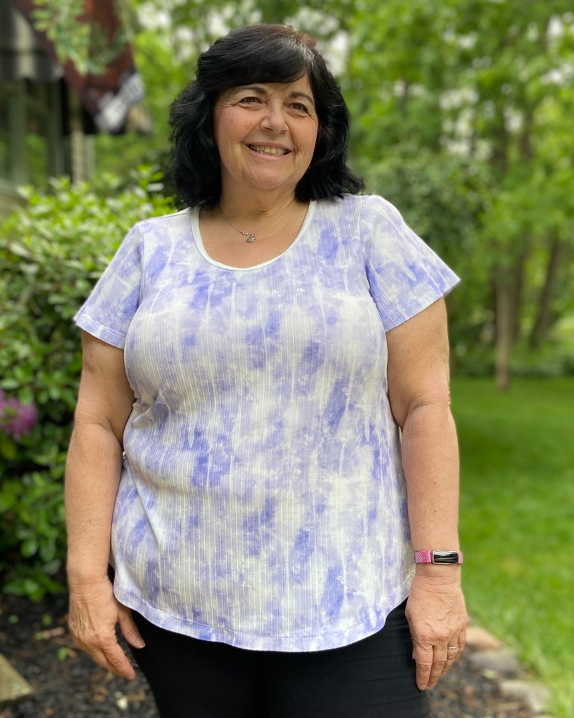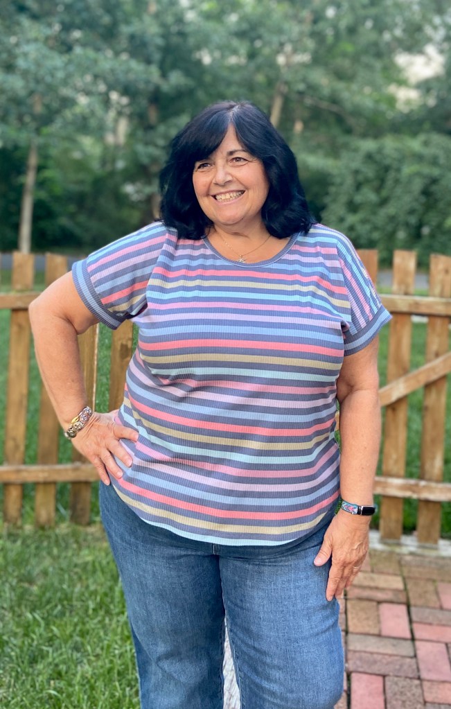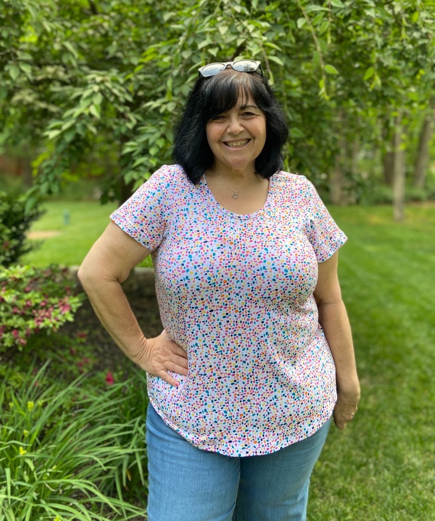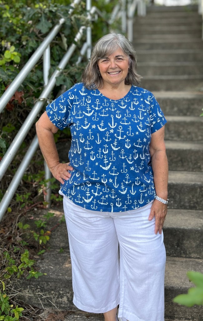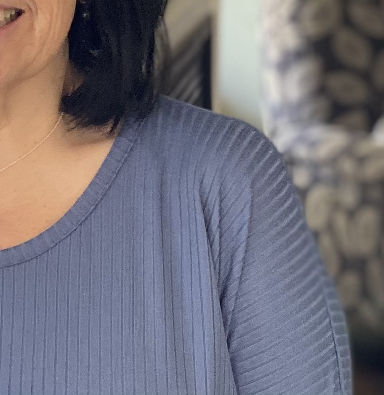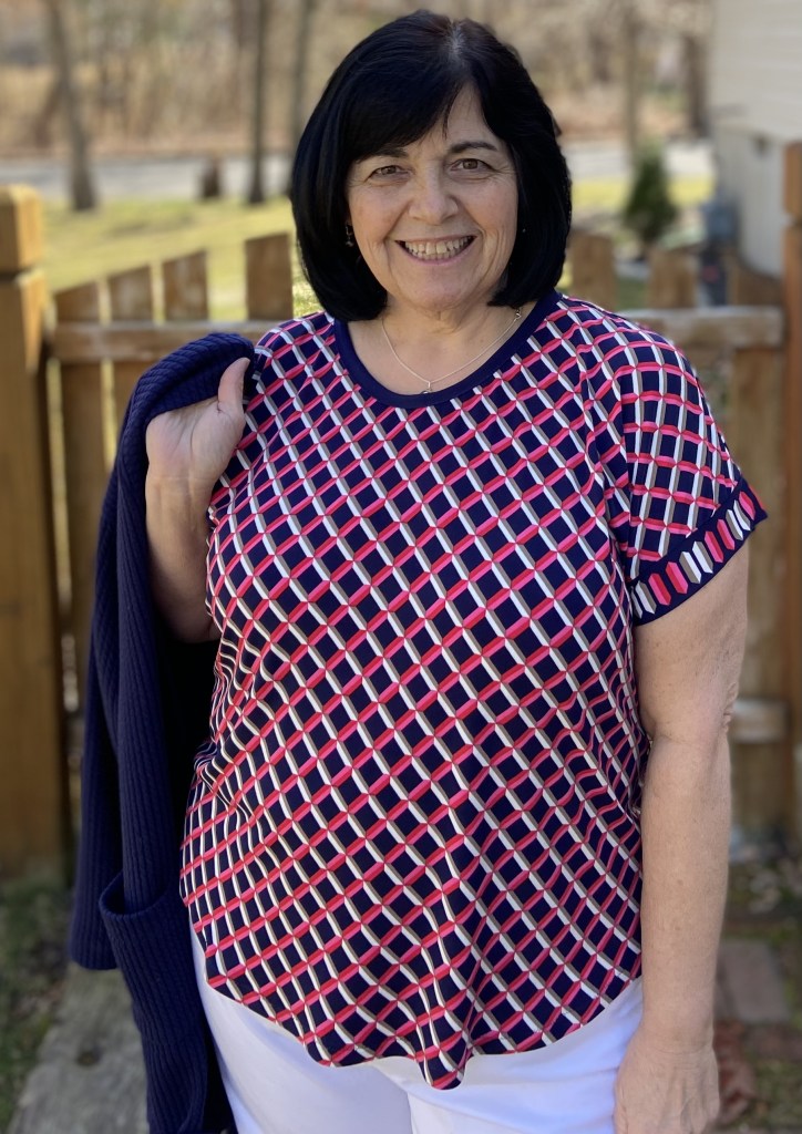 Since I am only 5 feet tall, I did shorten the top by 1″. I do prefer to wear my tops a tad longer, so the 1″ was the perfect amount for me. If making the shirt tail hem, it’s important to determine your finished length before cutting out your fabric so that you can maintain the nice hem shaping.