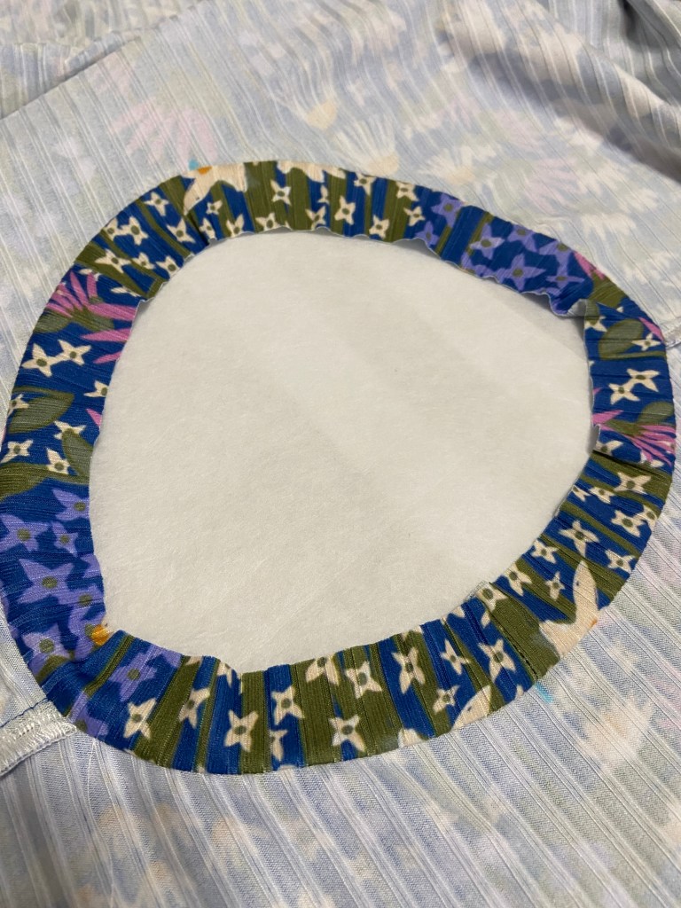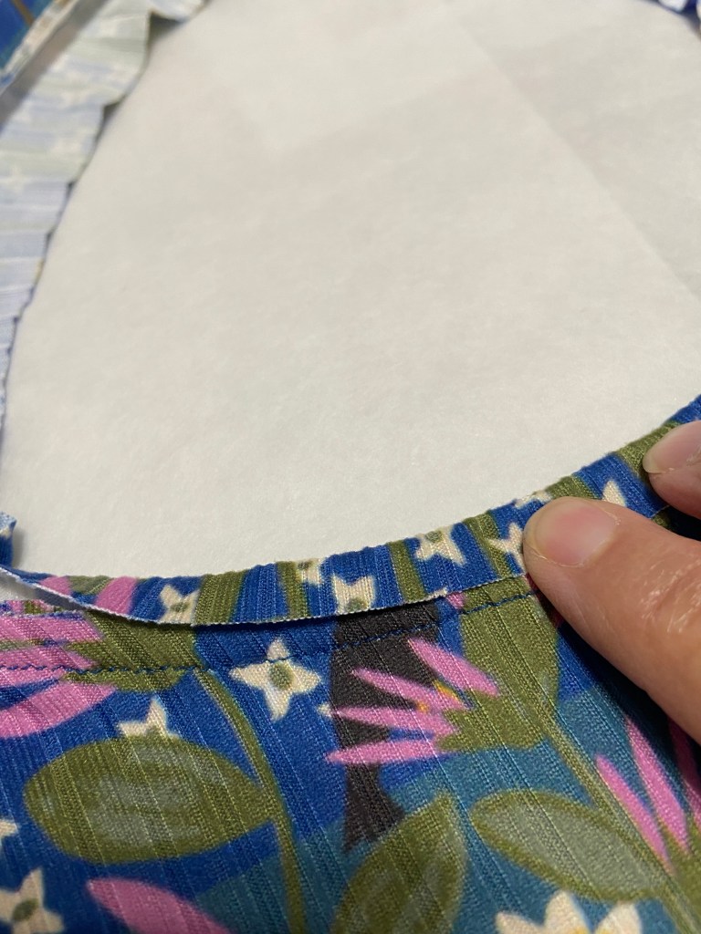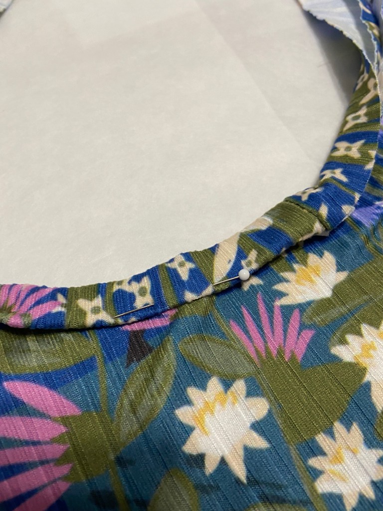 - Sew the neck binding around the neckline using a 1/4” SA ( This can be sewn with either 1/4″ or 3/8″ SA, depending on how wide you would like your binding to be.