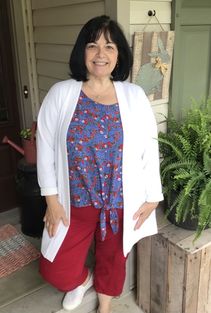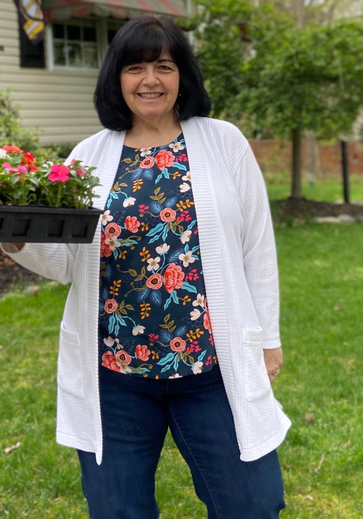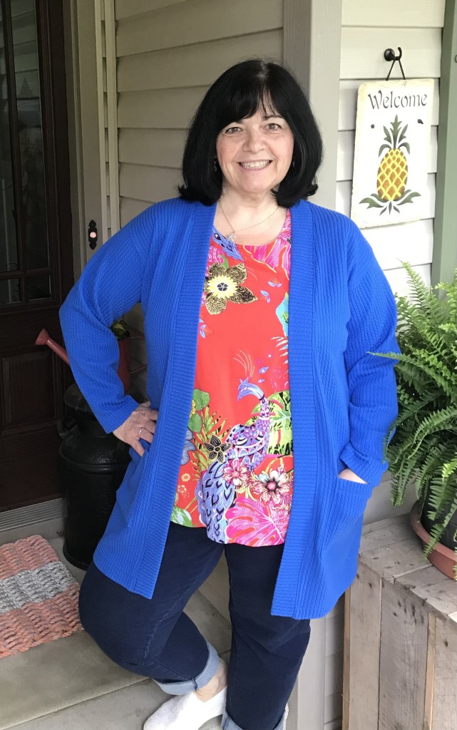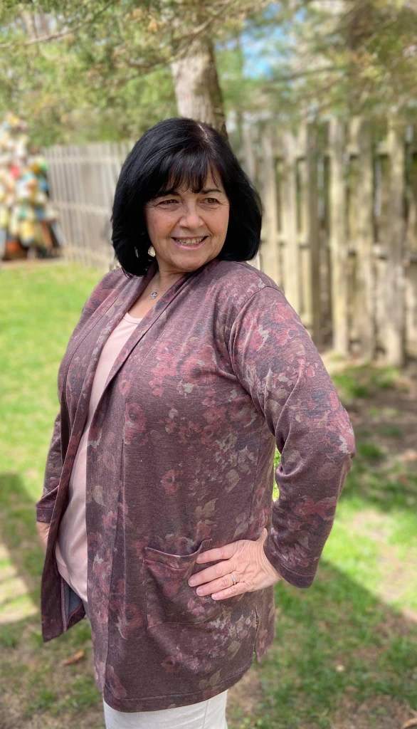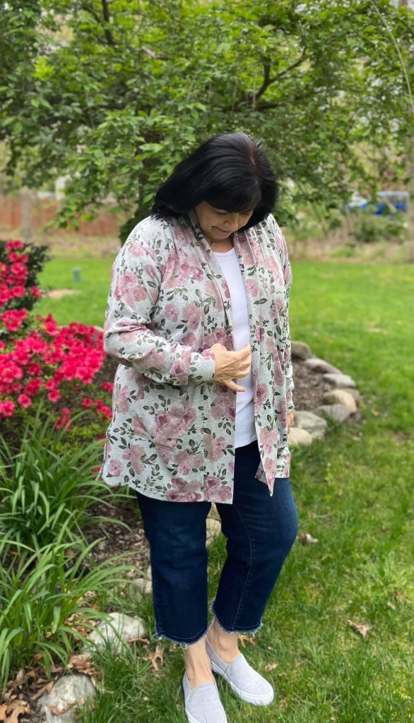 The Boyfriend Cardigan is an open front style. It is NOT supposed to close in the front. It has a slightly relaxed fit with a drop shoulder and slouchy pockets. The pattern is drafted with gentle shaping at the waist at the sides and center back~ thus avoiding that boxy look. The shorter version hits about mid thigh. I haven’t made the duster version~ mainly because I think I’m too short(and round) to wear a duster.