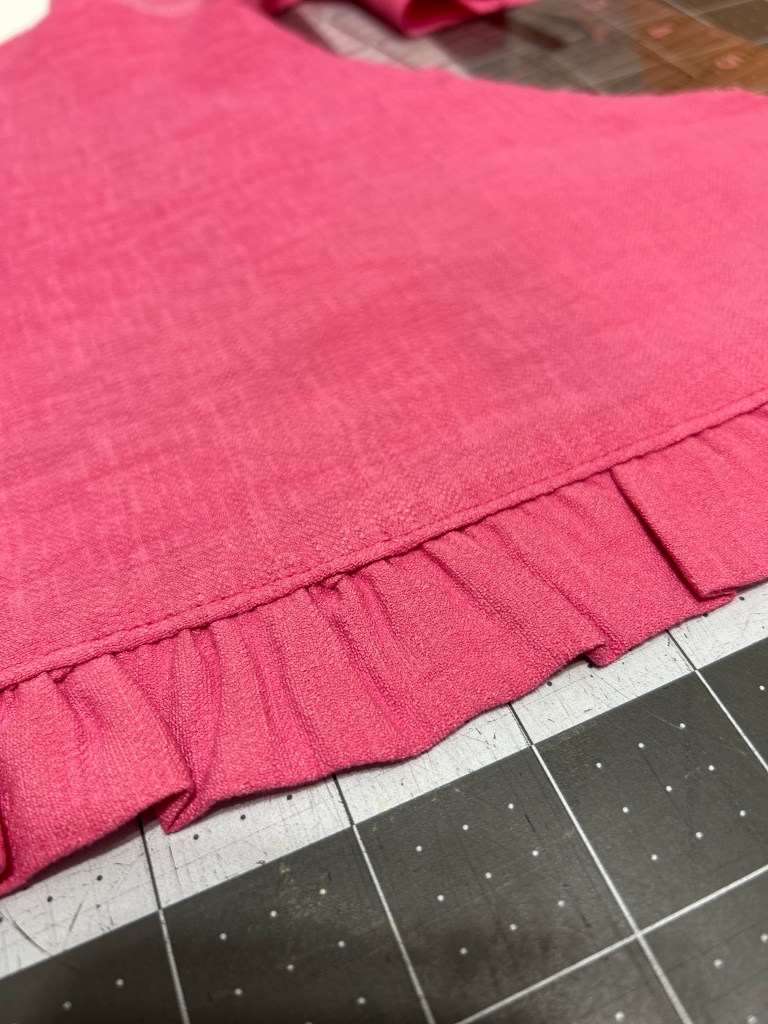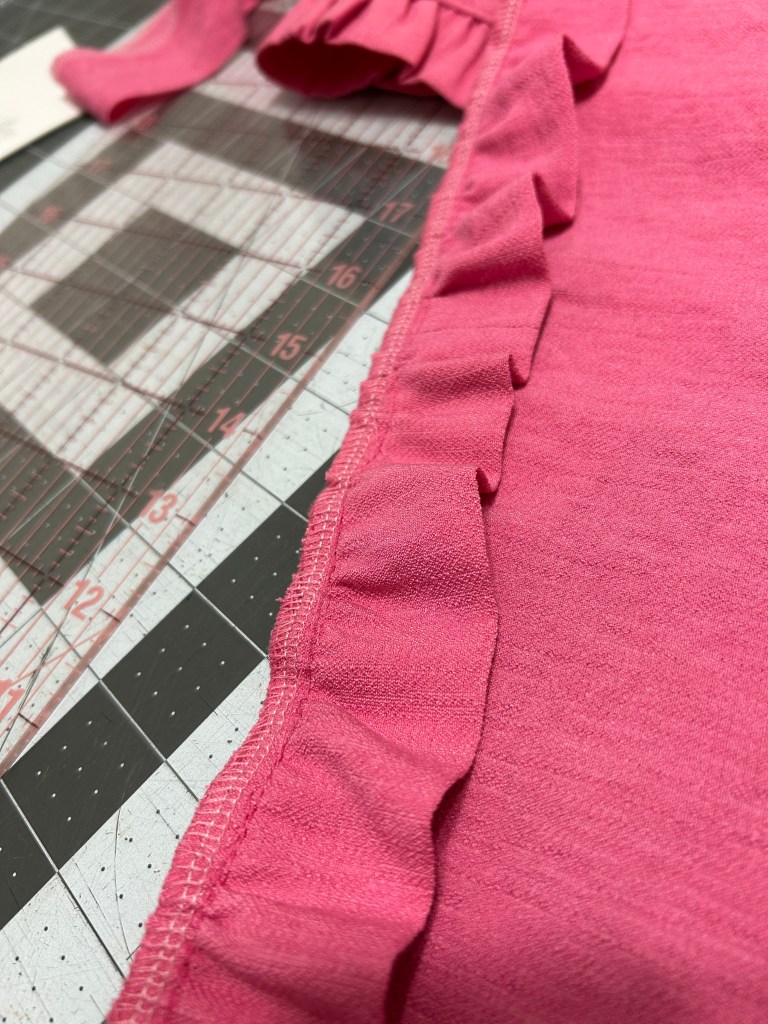 - Press ruffle down away from sleeve and topstitch down. This helps to keep the ruffle from flipping up when wearing.