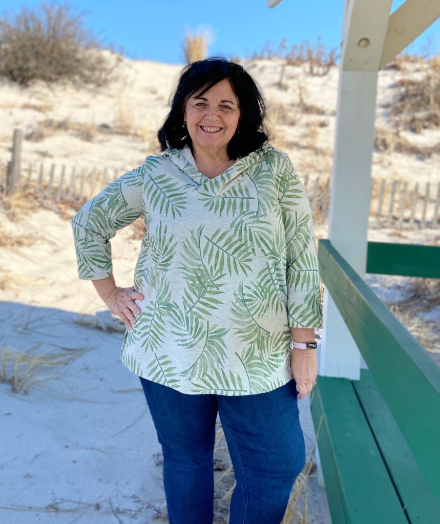 For Winter the V-neck hooded version is my favorite! The black animal print version is made from a mid-weight sweater knit from Stylemaker Fabrics. The Oatmeal Palm Leaves version is the “infamous” Oatmeal French Terry from Raspberry Creek Fabrics. It is just the cuddliest Terra ever!!!