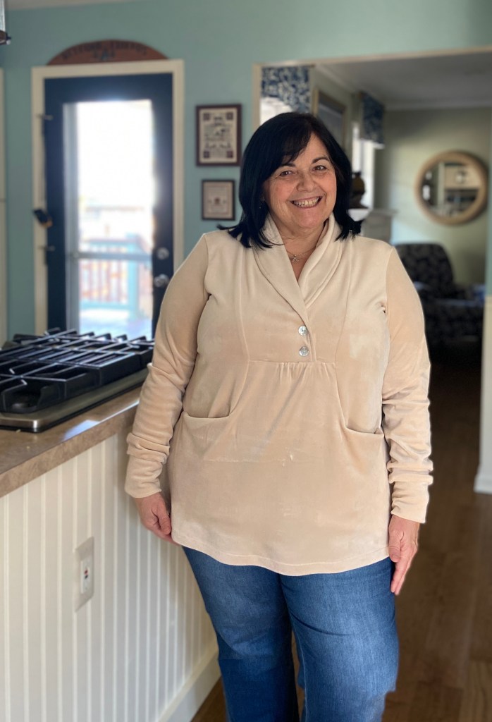 The gray French Terry version was the first Whistler I made, before I was a Love Notions Ambassador. I still love wearing this one! I used the wrong size of the fabric for the shawl collar. This fabric was probably 10 years old when I pulled it out of my stash! The tan version is a stretch velour from Surge Fabrics. Talk about soft and warm!! This is still in stock. You can find it HERE.