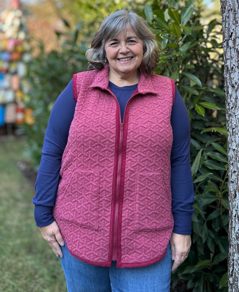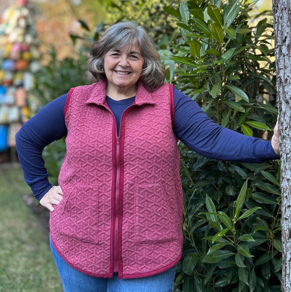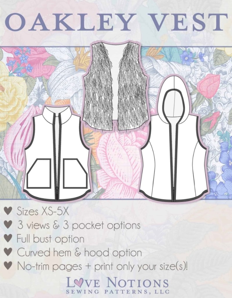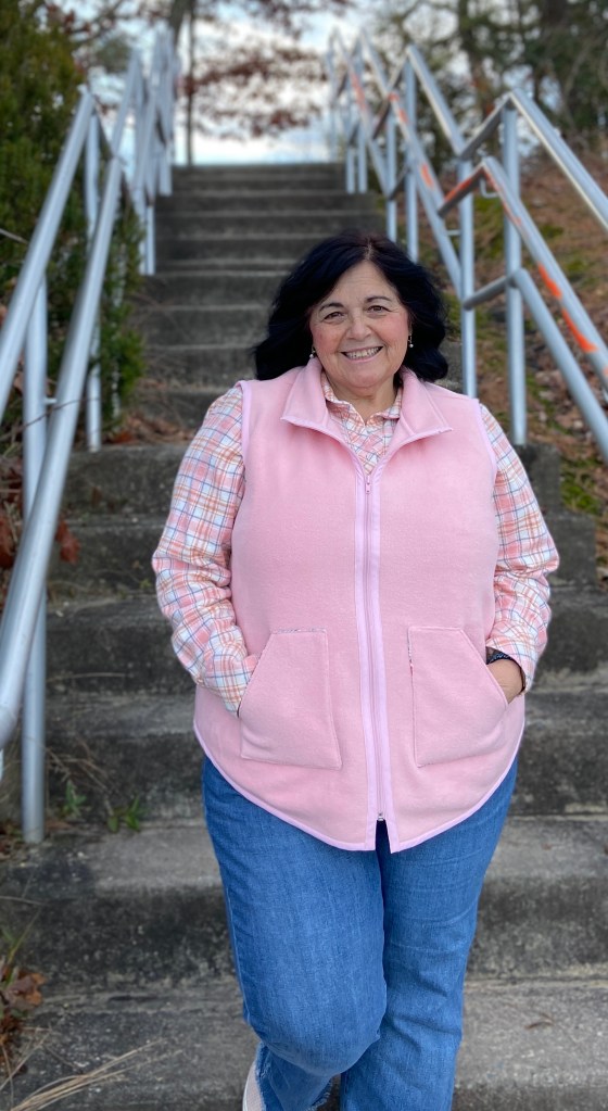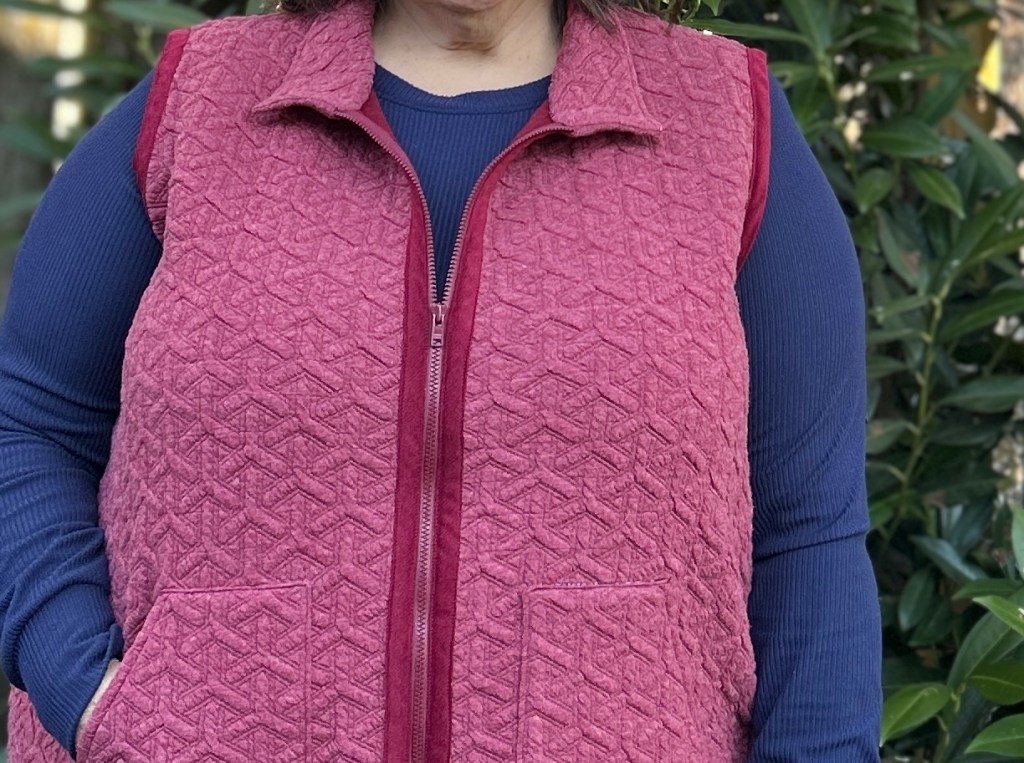 My cream Oakley is made from a quilted sweater knit. I wore this constantly all Fall and I’m wearing it this Winter too. This fabric is from Surge Fabrics. They have a great selection of quilted knits. The pink fleece version is my grab and go vest. I reached for it all Fall when I just needed a lil something. I’m getting a lot of wear out of it this Winter too. This is the only time I ever found a use for the fleece that my Joann’s is filled with!