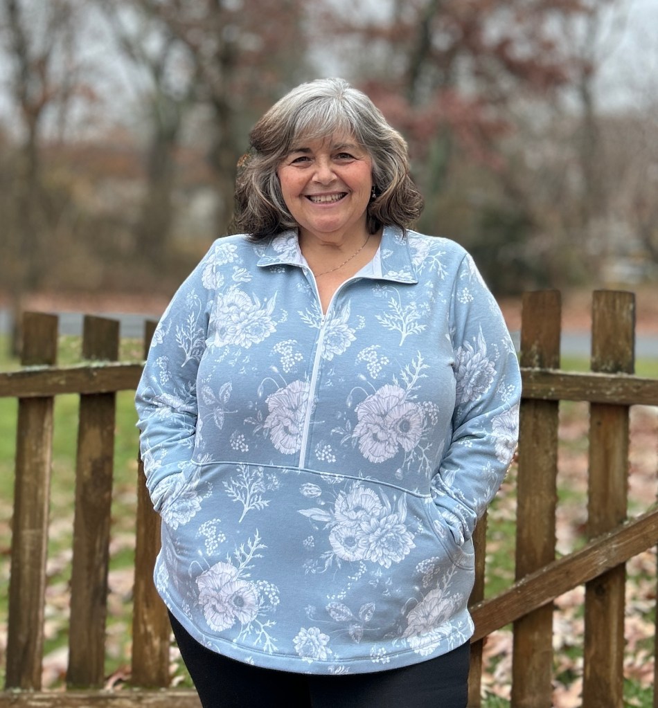 Above are my two newest Constellations I made for this winter. The Oatmeal Quilted Sweater Knit is just so warm! I don’t remember where I found this knit, but Surge Fabrics has a great selection of quilted sweater knits. The dusty blue floral is a sweatshirt fleece from Raspberry Creek Fabrics. You can find that fabric HERE. Both of these have minimal stretch~ but work great with this pattern!
