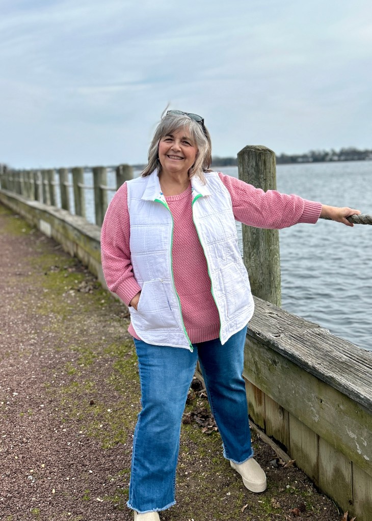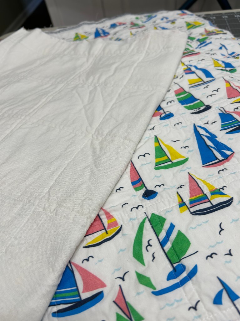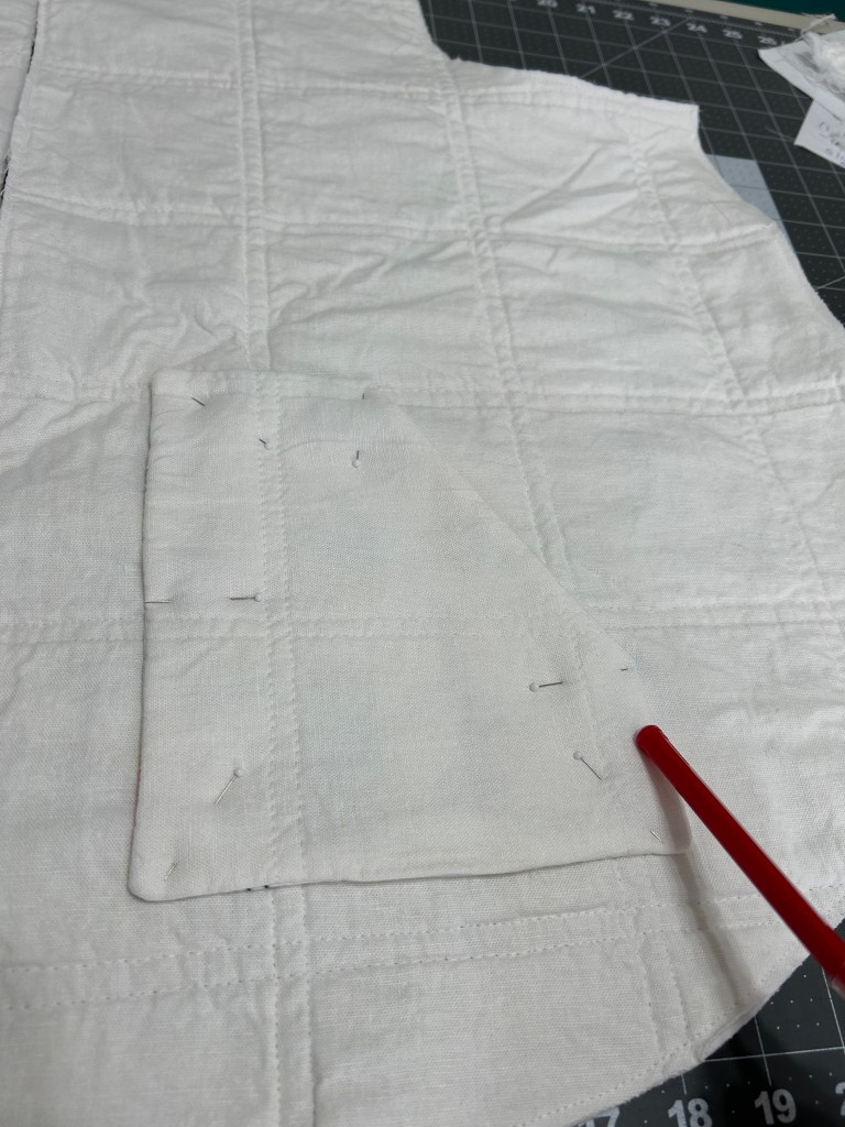 When I begin to plan my warm weather makes, I always lean towards my “go-to” colors: pinks, bright greens, navy and of course white. I also LOVE sewing and wearing linen during that time of year. So of course, I decided I wanted a white linen vest with a fun “coastal and preppy” lining. So I started by search for quilted linens~ and nope, there were none to be found. So I did what I needed to and quilted my own!