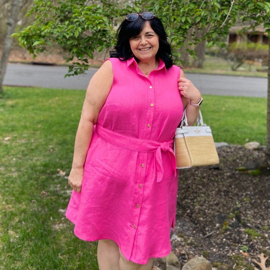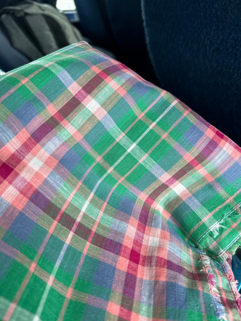 Don’t forget~ the Aria button down also includes an awesome dress! I made this bright pink linen version when the pattern first released. Yesterday, I bought this green cotton madras plaid in NYC to copy a dress I saw in Brooks Brothers.