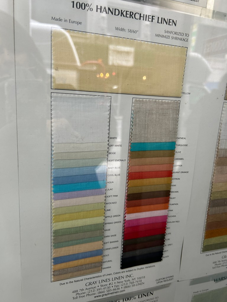 The handkerchief linen is from GrayLines Linen in the NYC Garment District as well. This is another great shop~ it only sells LINEN!