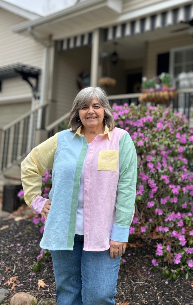 I had to empty my sewing room last month in order to have it painted and a new floor installed. So before that “mess” began, I cut out all 4 of these Arias. Not only did I cut the fabric, I cut all the interfacing pieces and attached them to all the fabric pieces. Then I did all the pinning and sewing on all 4! I did have to change threads a few times, especially for my color blocked version. So these 4 new Arias were sewn in my kitchen in March. They did however, just get their buttonholes and buttons just last night. Now they are all ready and waiting for Spring to decide to come back!