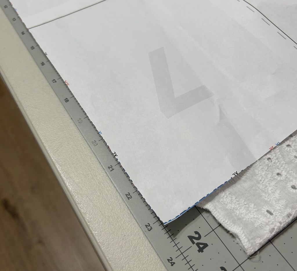 Start with the Bishop Sleeve pattern piece. I shortened the pattern one inch since my eyelet has a border edge and was not going to be hemmed. If you are hemming your fabric, you may not need to shorten your sleeve at all. I suggest cutting a sleeve from some muslin and sewing it up and trying it on your arm to determine the correct length for you. You can also simply try on your Timbre since it will already be assembled to determine the length.