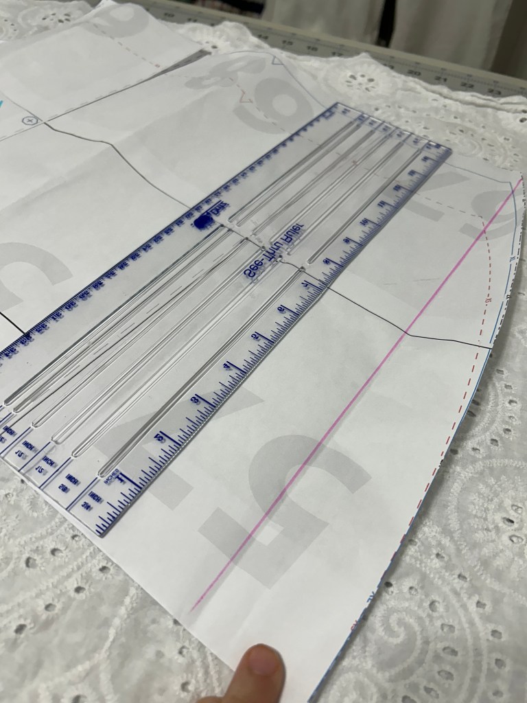 - Remember to take the hem allowance off your pattern piece, otherwise your top may be too long and you won’t be able to shorten it later. I took 1″ off the length of my pattern.
