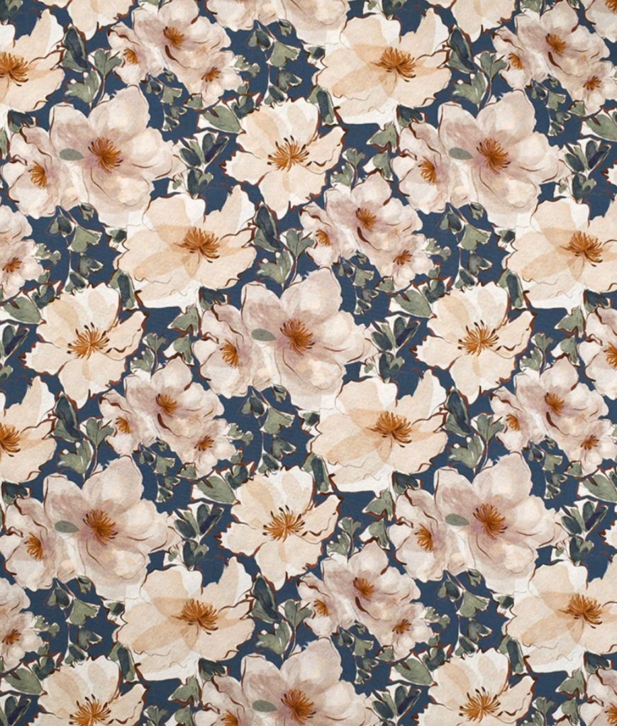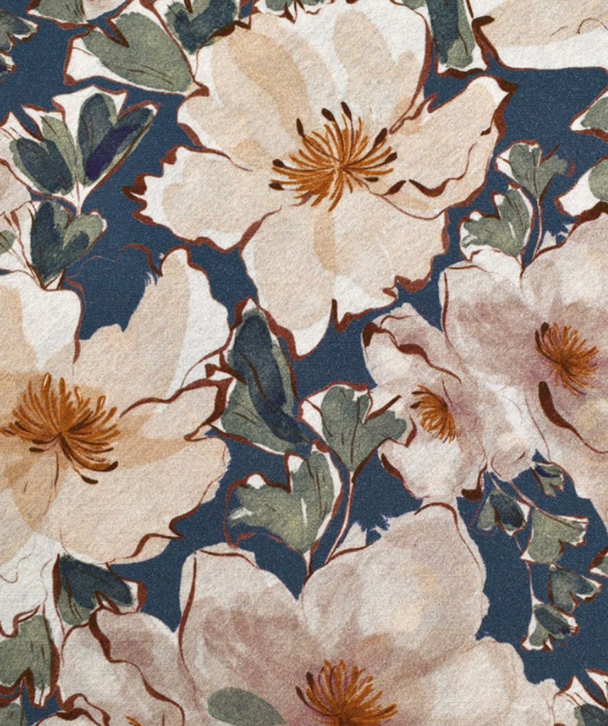 I selected this Painterly Autumn Floral Stretch Rayon Poplin in Ocean. It is also available in an Orchid color way. You can find this floral rayon poplin HERE.