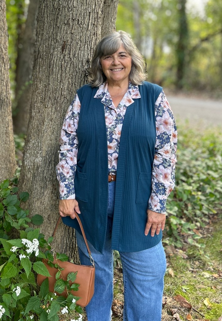 The Boyfriend Cardigan “Vest” is simply a boyfriend cardigan without the shawl collar, (There is a cutting line on the shawl collar piece to reduce it to just a band). The only thing I did was leave off the sleeves! To finish the armscye I simple folded it to the inside and topstitched it. I didn’t want a facing that would potentially stick out. You could also finish the armscye with bias tape or a strip of your fabric. Want to read/see more of my Boyfriend Cardigans? Visit this blog post.
