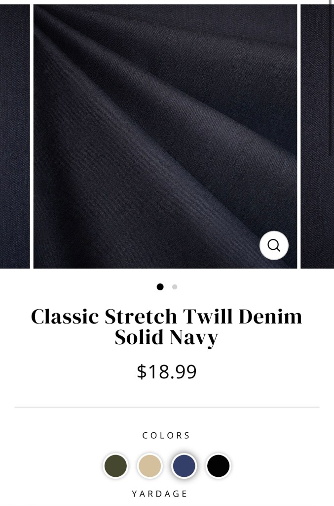 Classic Stretch Twill Denim~ Available in 4colors, Details: Cotton/Poly/Spandex, 20% stretch, 54″ wide, $18.99 per yard. You can buy this fabric HERE.