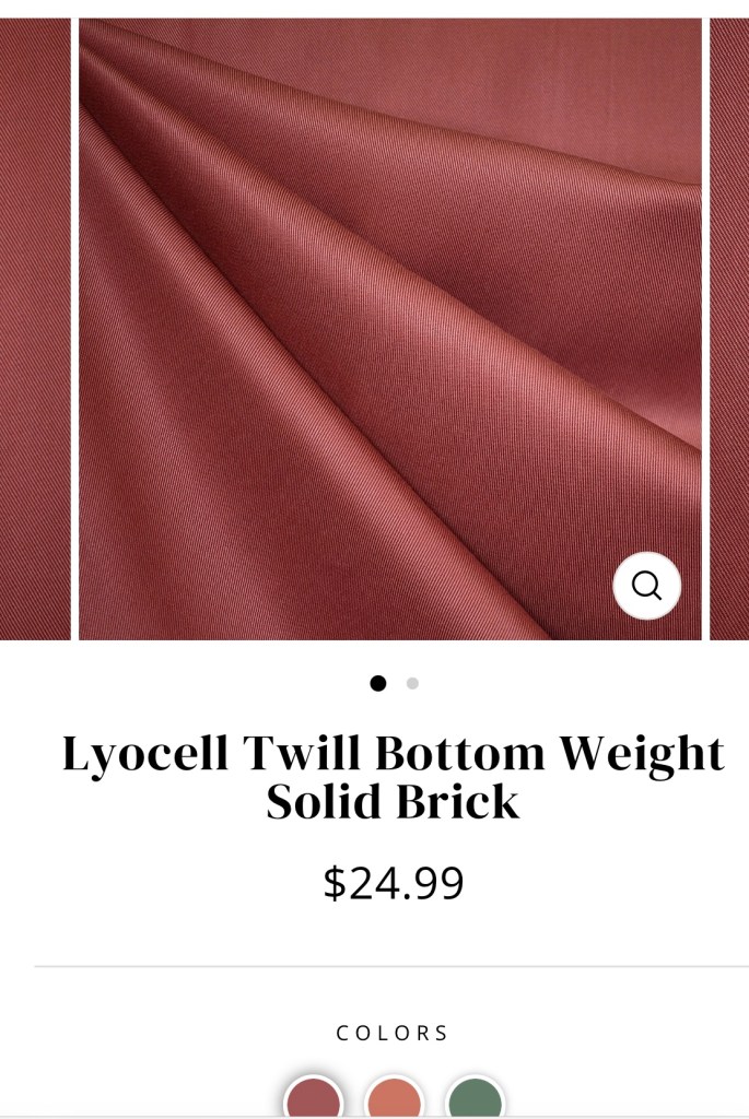 Lyocell Twill Bottom Weight~ Available in 3 beautiful Fall colors, Details: Lyocell Rayon, 56″ wide, $24.99 per yard. You can buy this fabric HERE