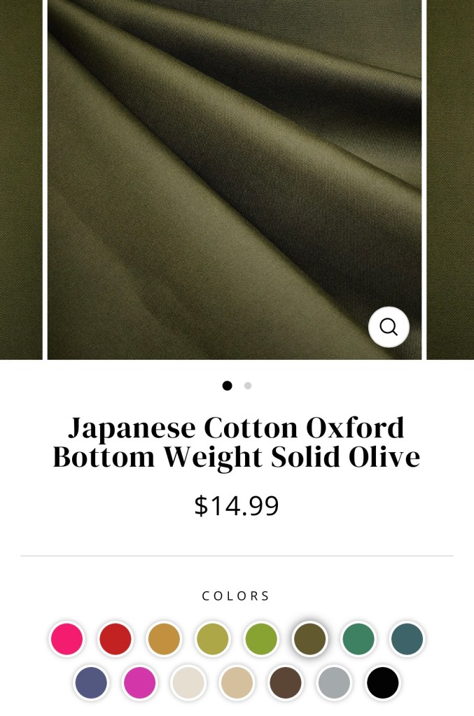 Japanese Cotton Oxford ~. Bottom Weight fabric, Available in 15 colors, Details: 100% cotton, 43″ wide, $14.99 per yard. You can find this fabric HERE.