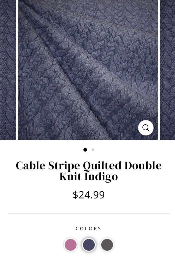 Quilted Knit~ I am really contemplating making a Pianoforte out of this quilted knit fabric. I have made Oakley Vests of this knit and I really love them. I think it would totally work for a jumper too! How cute and comfy would this be!!! Details: Several pretty colors for Fall and Winter, cotton/poly blend, 57″ wide,$19.99- $24.99 per yard. Check them out HERE.