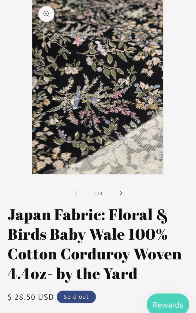 La Finch Fabrics~ gets deadstock fabric from the LA Fashion District. Sign up for emails as some fabrics arrive and sell out quickly. They recently had some printed floral corduroy. I was able to grab a piece of the crimson color way, but the navy had already sold out. This may have sold out so quickly due to her 30% off Anniversary sale. I highly suggest signing up for her emails and just buy when you first see something you want!!! My plans for what I did buy are undecided~ perhaps and Aria button down, a Clef Coat or many a Pianoforte. I really need to contemplate this one for a bit as it seems floral corduroy isn’t easy to find anymore!!!