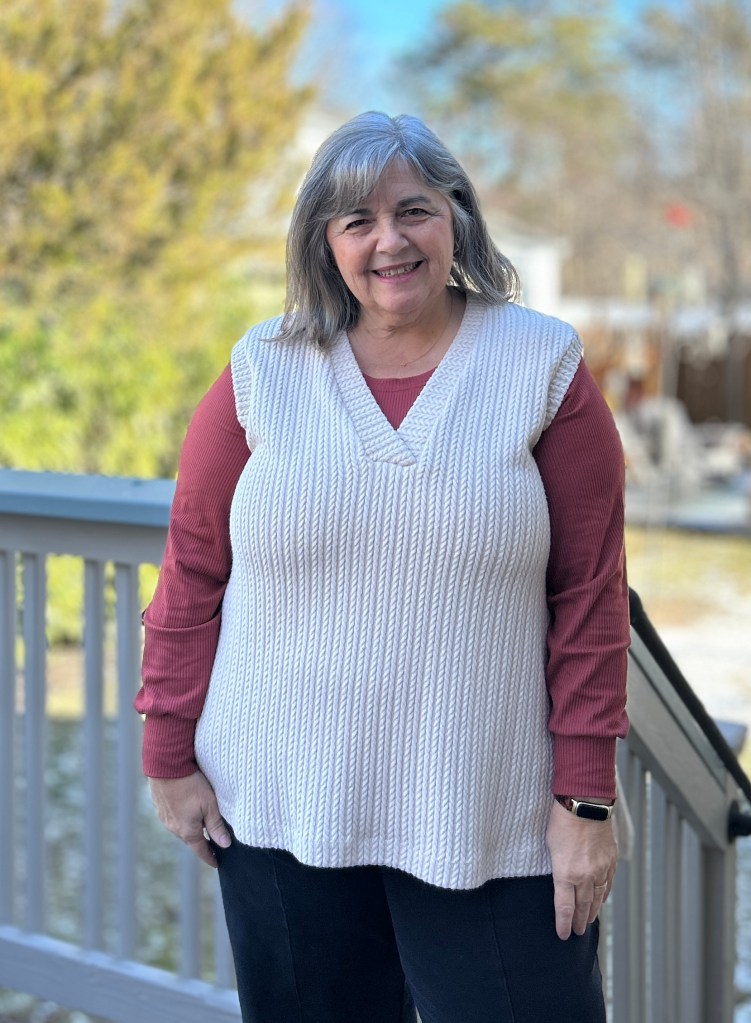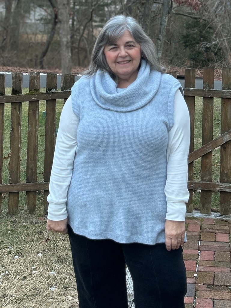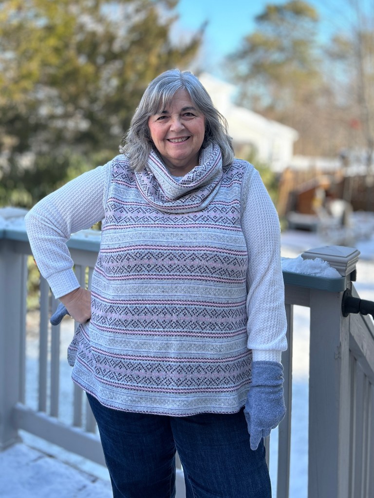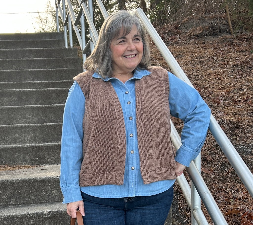 My Gray Fair Isle sweater knit version is from my Style Maker Fabrics stash. It has a nice amount of stretch but not the best recovery. I also shortened the armbands on this version. You can see my vest appears to fit looser.