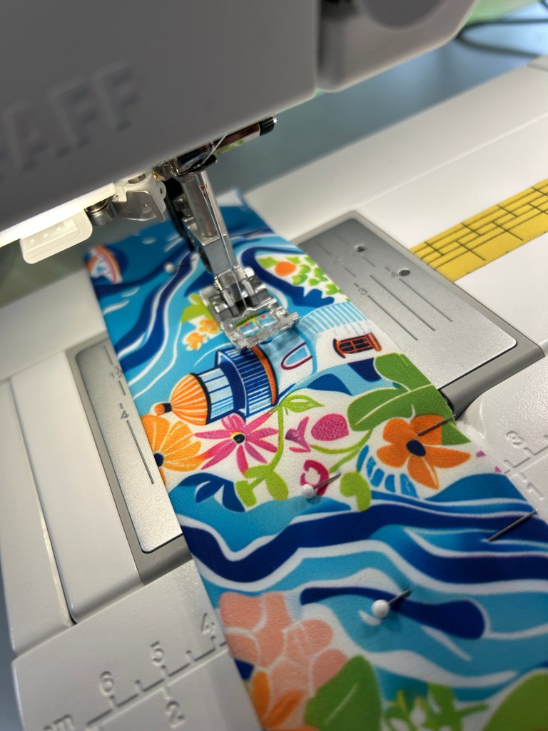 - Stitch 1″ away from the raw edges down the length of the waistband