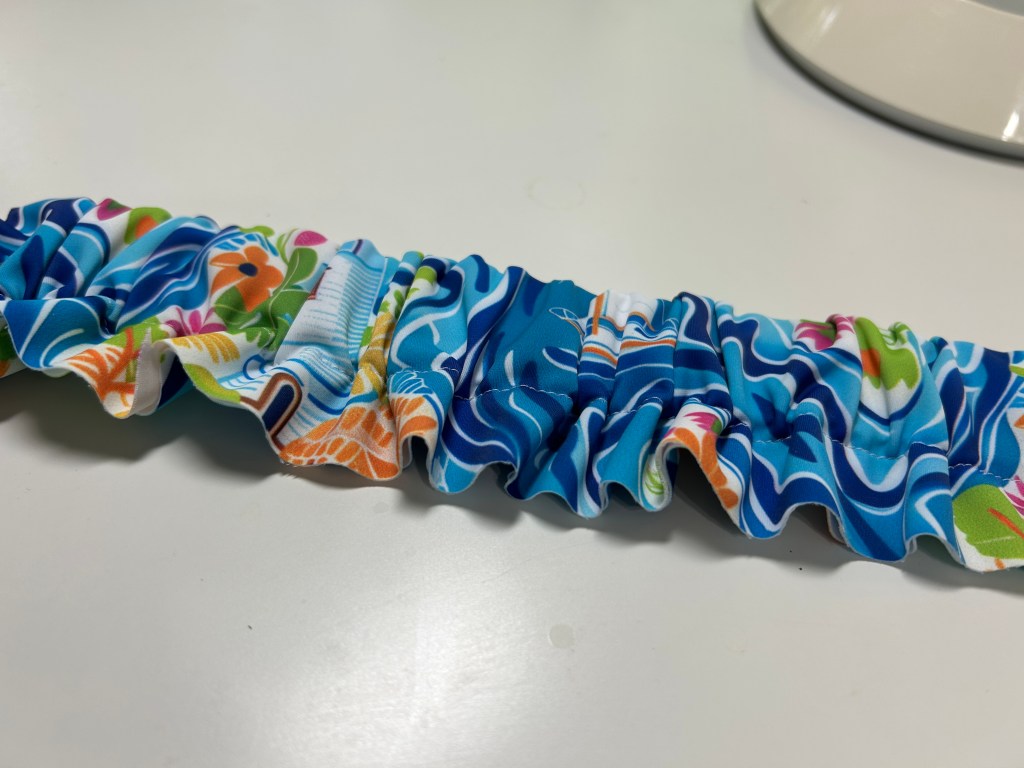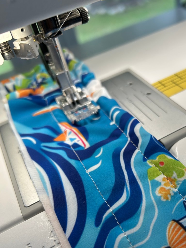 - Insert the elastic and sew across the short ends to secure the elastic. Use the elastic chart in the tutorial for the length of elastic to use for your size.