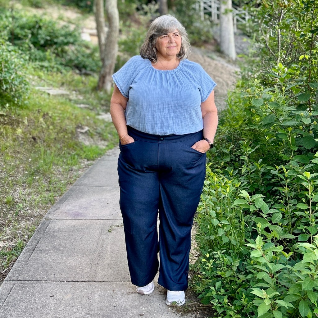 I am so excited for this new pattern release! I jumped at the chance to test this new pattern, even though I NEVER sew pants for myself! I admit, I have a hard time finding pants that fit my full hipped and short body~ and I am amazed at how these fit me~ read more on that below.