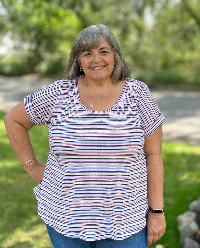 - Hey June Santa Fe Top in a multi-color striped rib knit from NYC garment district