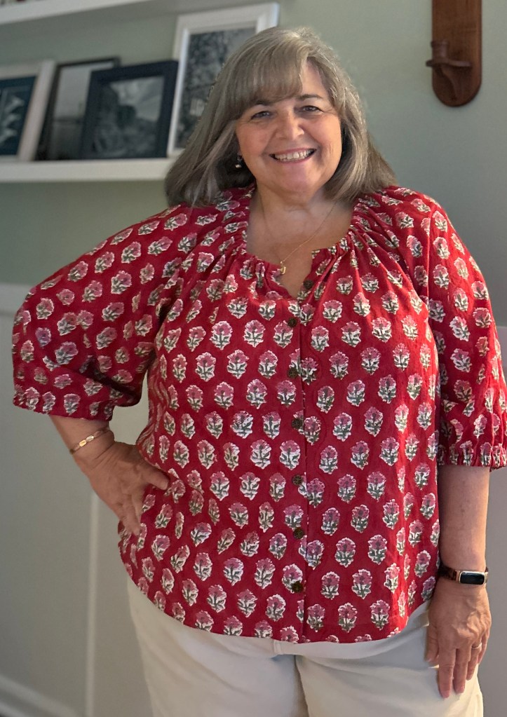 - LN Timbre button-down with 3/4 sleeves in a cotton batiste Block print from Blackbird Fabrics