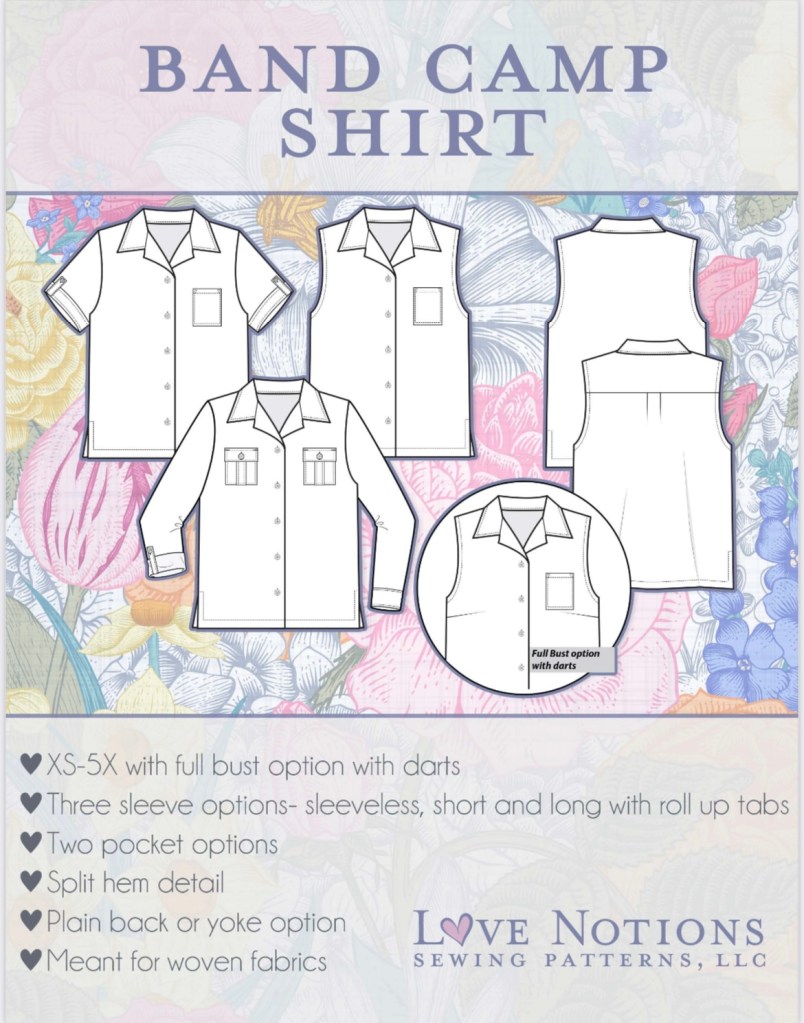 Please be sure to click over to my blog post all about the Band Camp Shirts~ there is a ton of information there. I’ve updated it to include new photos AND talk a bit about how different fabrics create totally different looking shirts. All my sizing details are there as well as some sewing tips too.