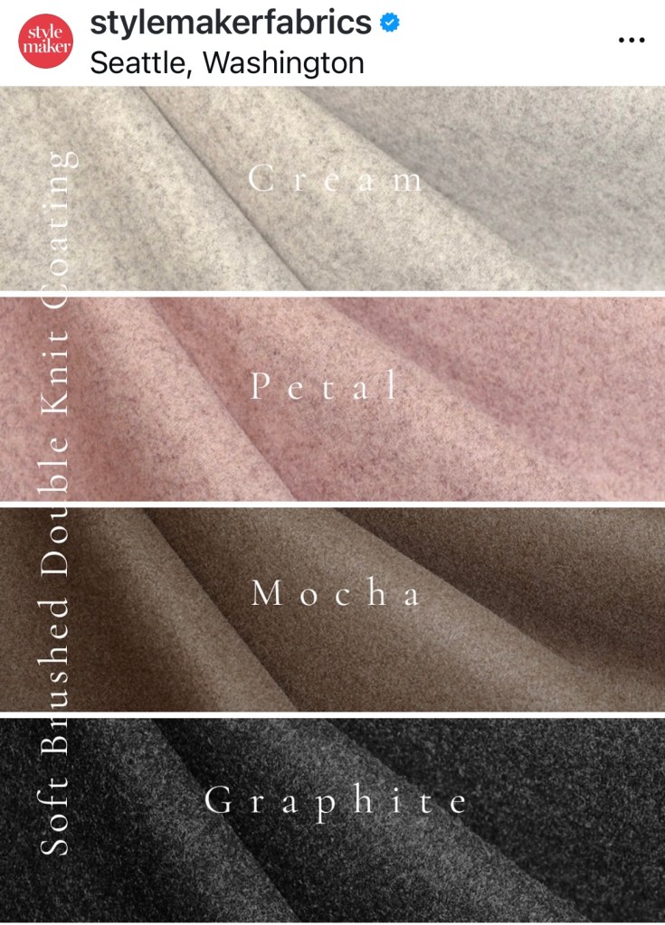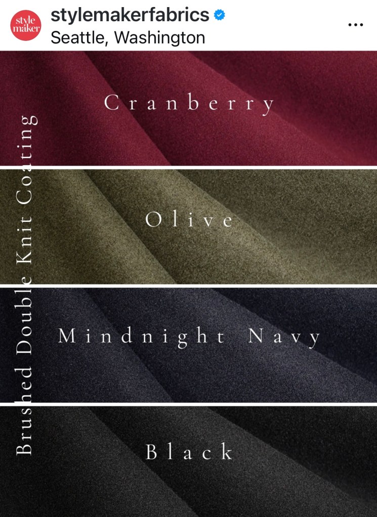 Style Maker Fabrics just added a few brand new coatings to their shop! They are PERFECT for the Octave Coat! If wool is too itchy for you take a look at these! They look AND feel like Wool Melton yet are made from a blend of poly, acrylic and rayon. They are 60″ wide and have 40% stretch. Don’t forget you can always order swatches from Style Maker Fabrics.