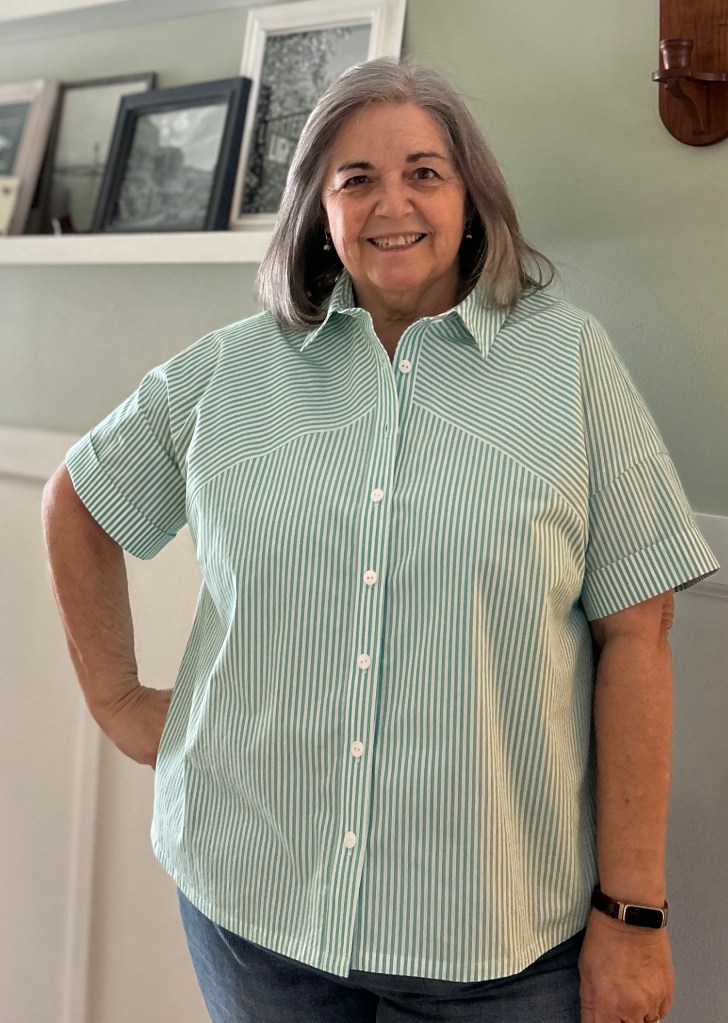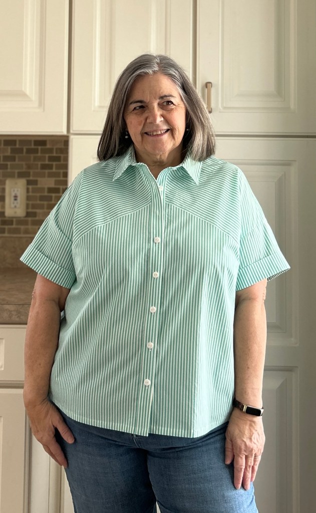 I found this pattern so enjoyable to sew!!! Is it a super fast sew, not exactly. It actually took me almost as long to get the pattern pieces laid out and cut as it did to sew it up. But, it was worth it! I absolutely LOVED the collar construction and directions. If you are new to sewing a collar with a separate collar stand~ this is a great one to start with. It’s the little things in the directions that can really make a difference in the finished garment. Trimming directions for the collar were amazing~ NOT trimming the seam allowance at the center front means you get a much cleaner finish!